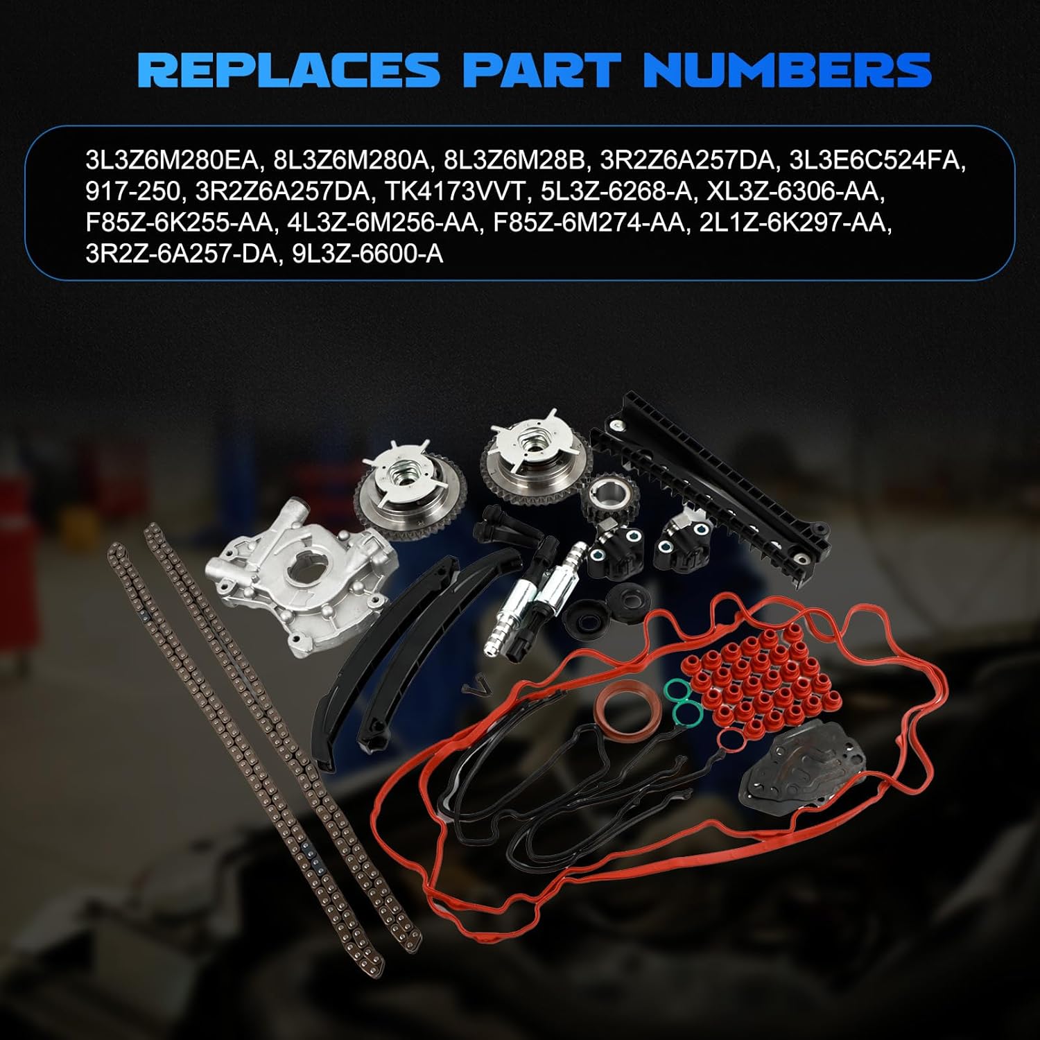 - Substitui OE – O Kit de Corrente de Distribuição do Motor substitui os números de peça: 3L3Z6M280EA, 8L3Z6M280A, 8L3Z6M28B, 3R2Z6A257DA, 3L3E6C524FA, 917-250, 3R2Z6A257DA, TK4173VVT, 5L3Z-6268-A, XL3Z-6306-AA, F85Z-6K255-AA, 4L3Z-6M256-AA, F85Z-6M274-AA, 2L1Z-6K297-AA, 3R2Z-6A257-DA, 9L3Z-6600-A.