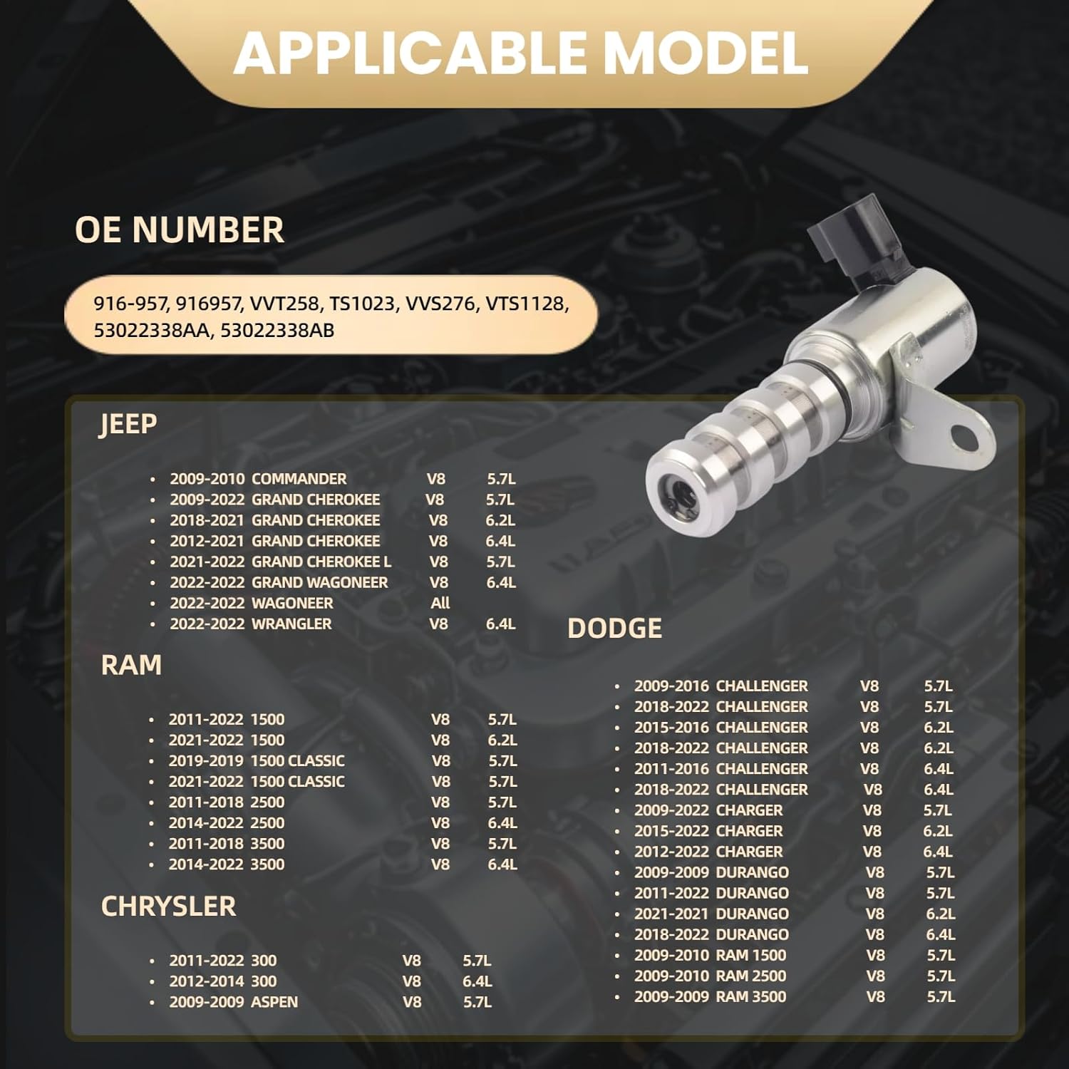 - FITMENT: Solenoide de Válvula de Tempo Variável compatível com Jeep Commander (2009-2010) / Grand Cherokee (2009-2022) / Grand Wagoneer (2022) / Wrangler (2022) / Ram 1500 (2011-2022) / Ram 1500 Classic (2019) / Ram 2500 (2011-2022) / Ram 3500 (2011-2022).