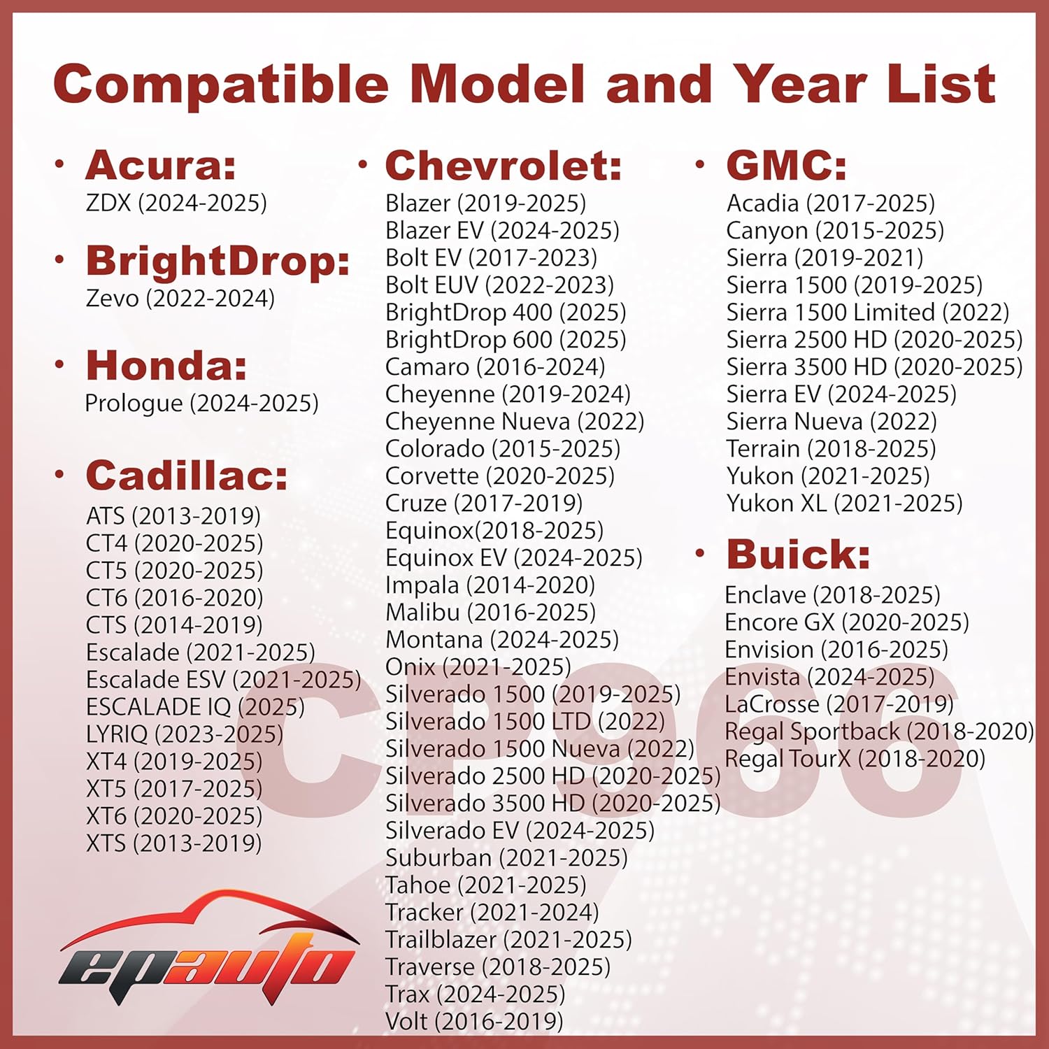 – Chevrolet: Blazer (2019-2025), Blazer EV (2024-2025), Bolt EV/EUV (2017-2023), Camaro (2016-2024), Colorado (2015-2025), Corvette (2020-2025), Equinox (2018-2025), Malibu (2016-2025), Silverado 1500 (2019-2025), Suburban (2021-2025), Tahoe (2021-2025), entre outros.