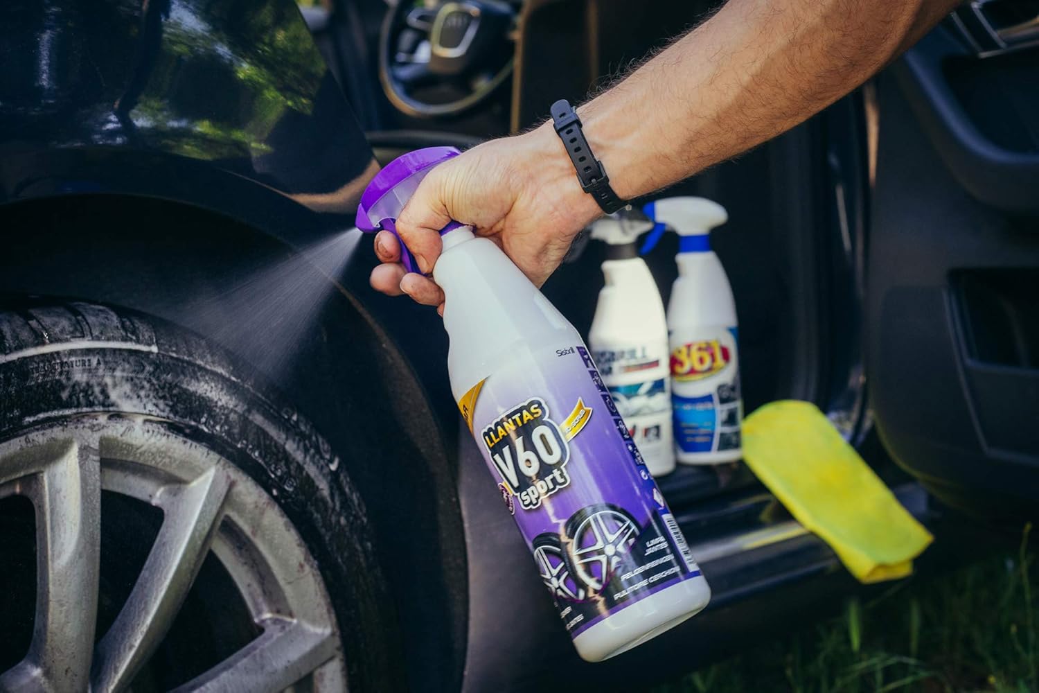 1. Limpeza das Rodas: Aplique o Spray V60 Sport diretamente nas rodas, deixando agir por alguns minutos. Em seguida, enxágue com água para um brilho radiante.