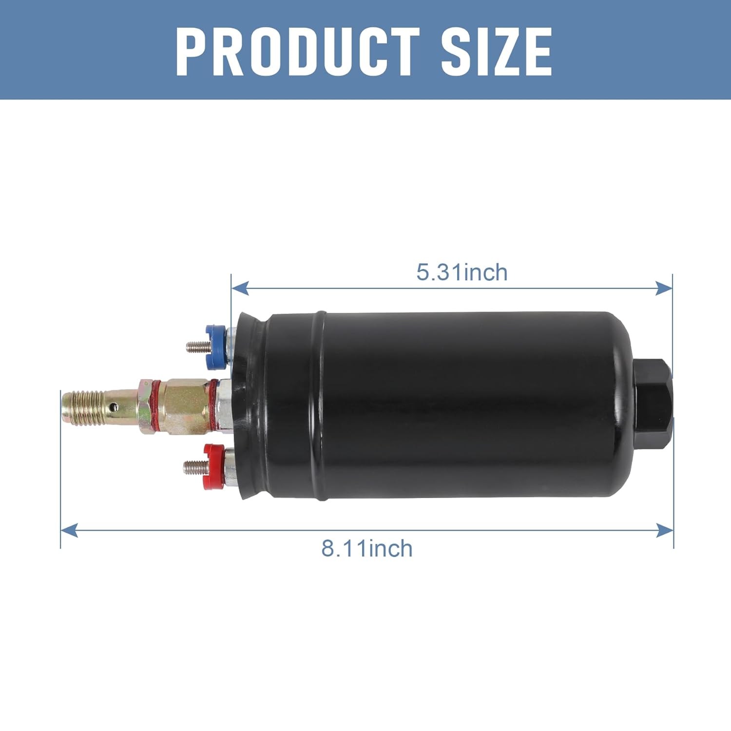 Esta bomba é projetada para operar com gasolina, gasolina de corrida e diesel, sendo também compatível com combustíveis alcoólicos ou E85, embora o uso desses últimos possa reduzir a vida útil da bomba. Com um fluxo de teste que varia de 200 LPH a 300 LPH, dependendo da pressão e da tensão, a bomba opera em uma faixa de pressão de até 75PSI (5.0Bar) e suporta temperaturas de operação que vão de -20℃ a 90℃ (-68℉ a 194℉), além de uma faixa de armazenamento de -40℃ a 70℃ (-104℉ a 158℉).