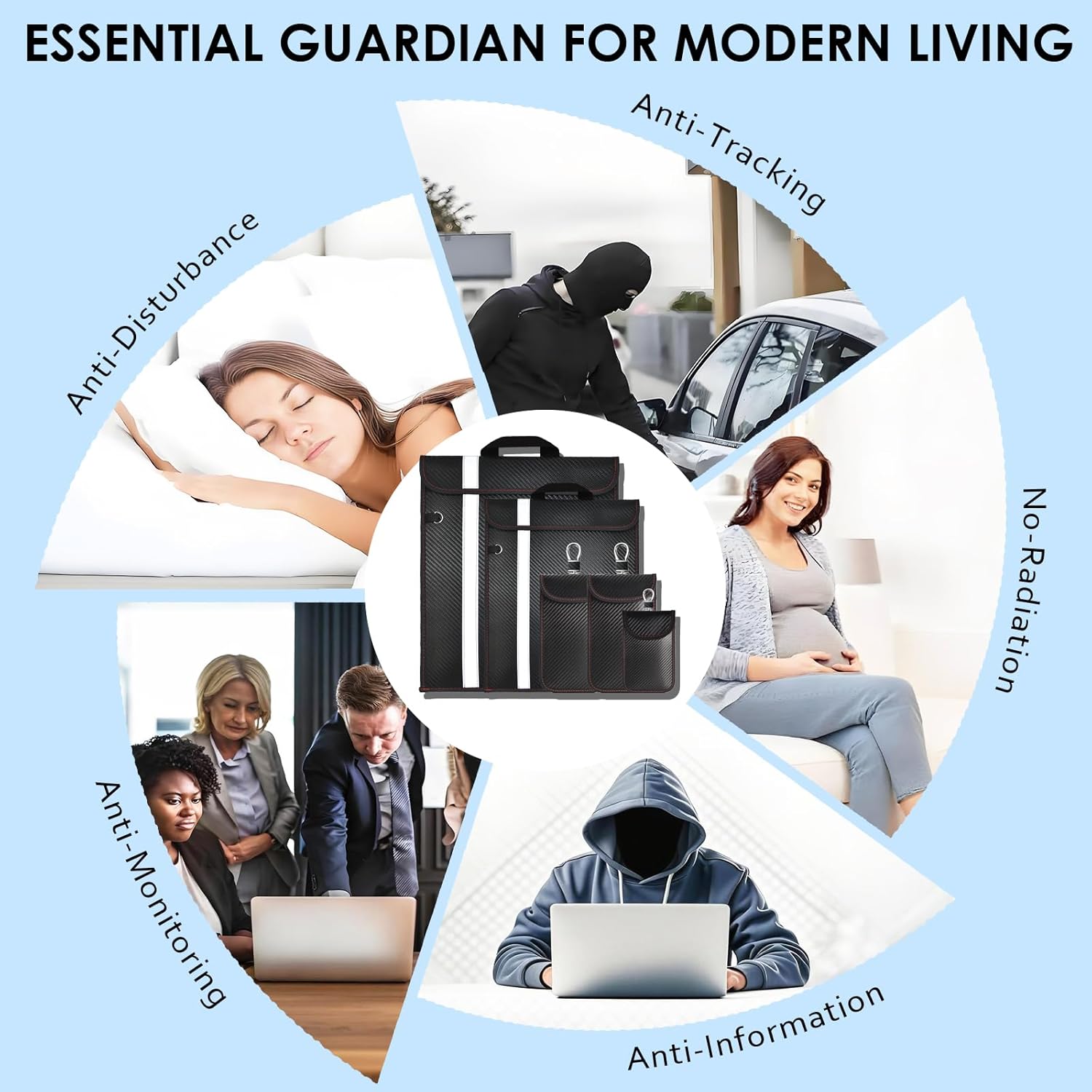 – Bloqueio de Sinal: Bloqueia sinais RFID, 5G e EMF em todas as direções.