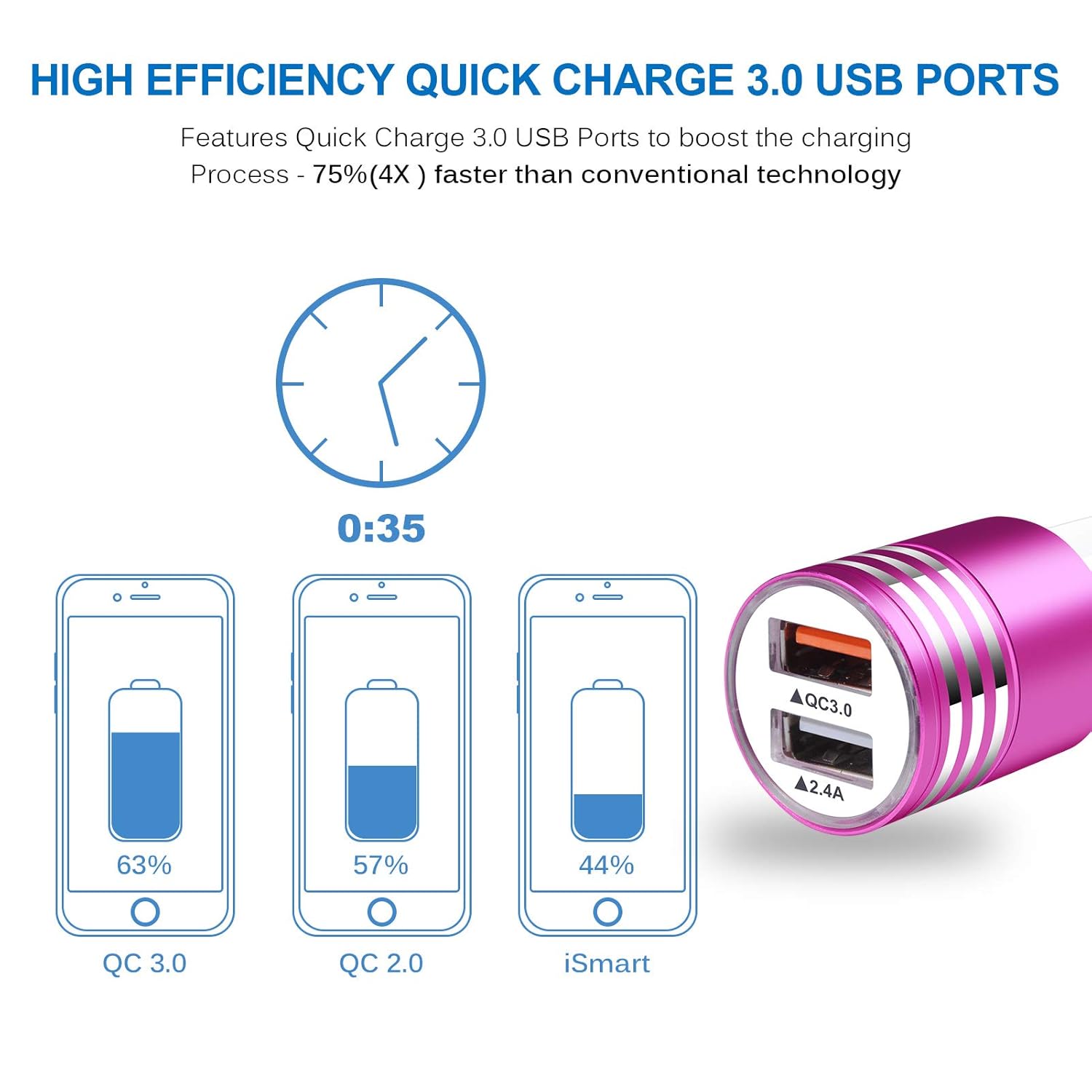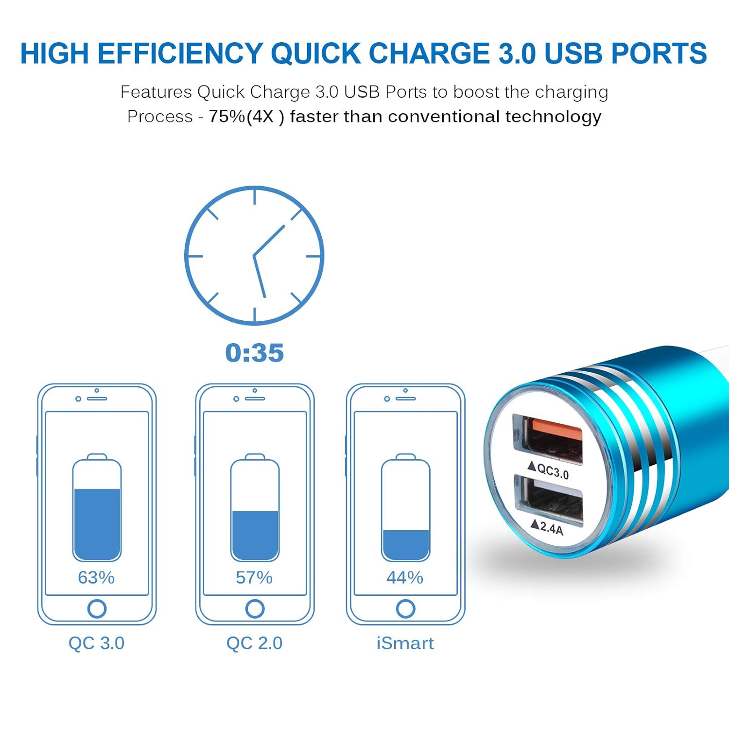 O carregador veicular possui uma porta QC 3.0 que proporciona uma velocidade de carregamento até 4 vezes mais rápida do que os carregadores convencionais. Em apenas 35 minutos, você pode carregar seu dispositivo até 80% da capacidade da bateria, permitindo que você continue utilizando a navegação e o streaming de mídia sem interrupções. Para dispositivos que não são compatíveis com Quick Charge, a porta de 2.4A também oferece um carregamento significativamente mais rápido do que os carregadores de 2.1A.