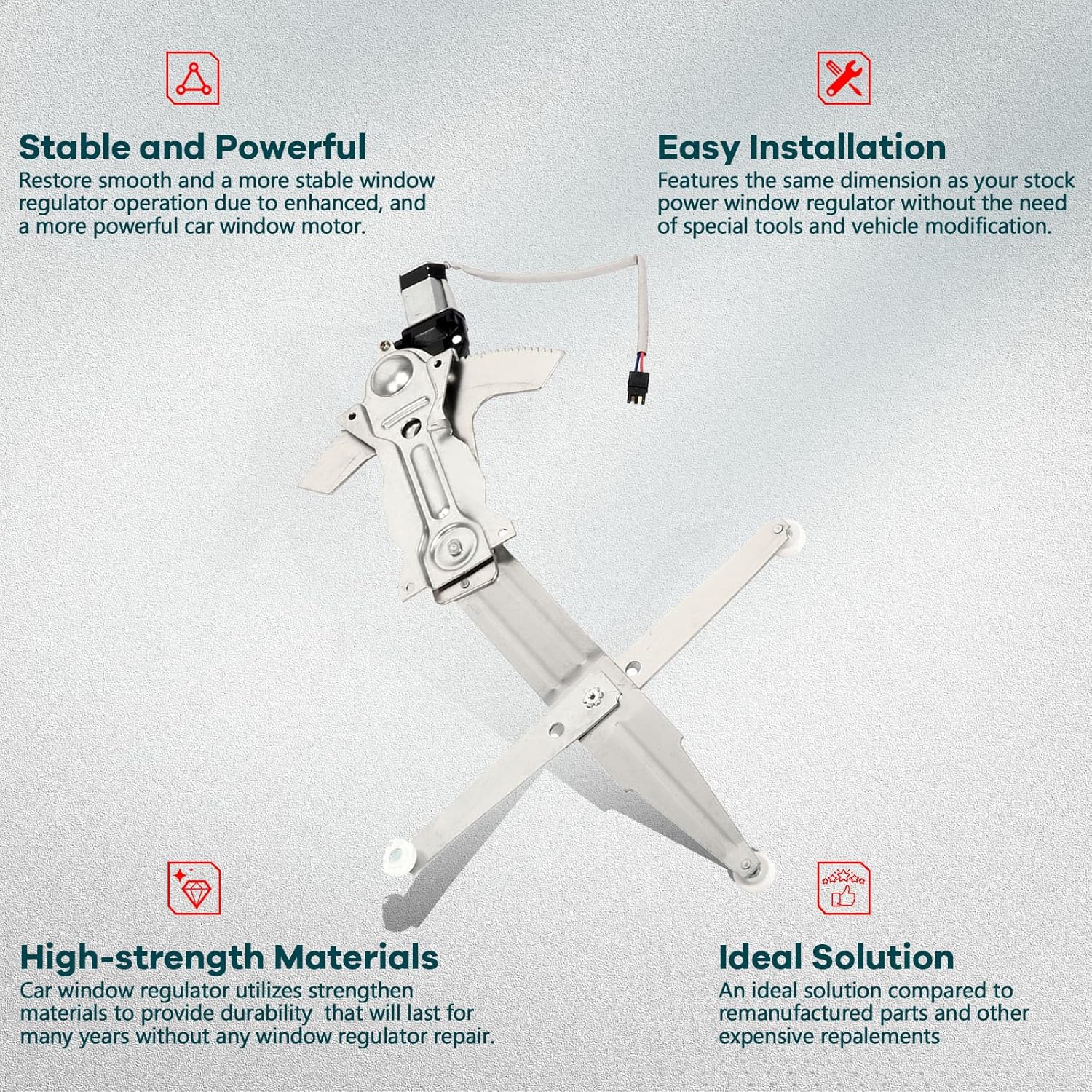 - Confiabilidade: Construído de acordo com os padrões originais de equipamento (OE), o regulador de janela elétrica desliza de forma rápida e silenciosa. Passou por testes rigorosos, sendo acionado milhares de vezes em portas de veículos reais para garantir sua durabilidade.