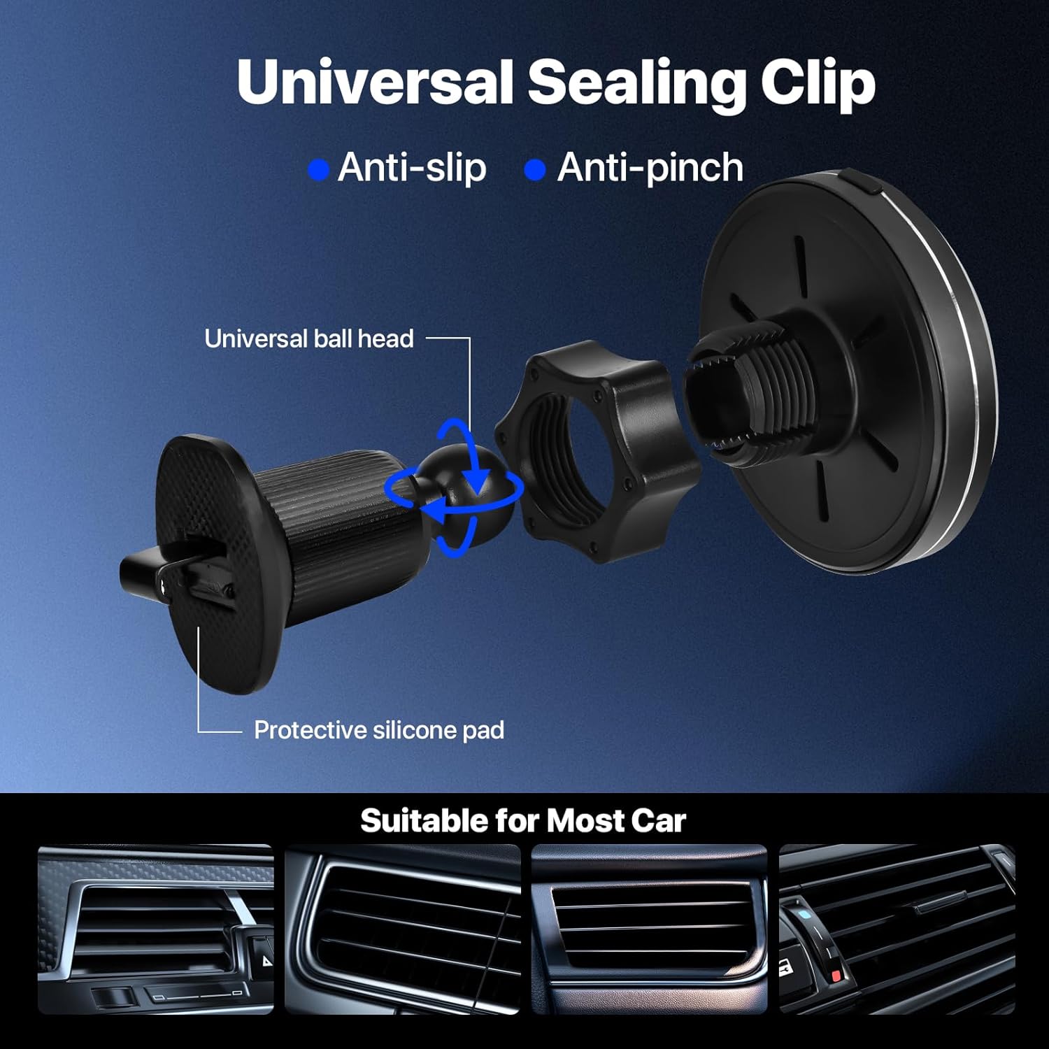 – Compatibilidade Universal: Funciona perfeitamente com iPhones e capas compatíveis com MagSafe, suportando carregamento através de capas com espessura de até 3mm. É compatível com a maioria das aberturas de ventilação e painéis de carros, incluindo um suporte de gel adesivo e base de encaixe.