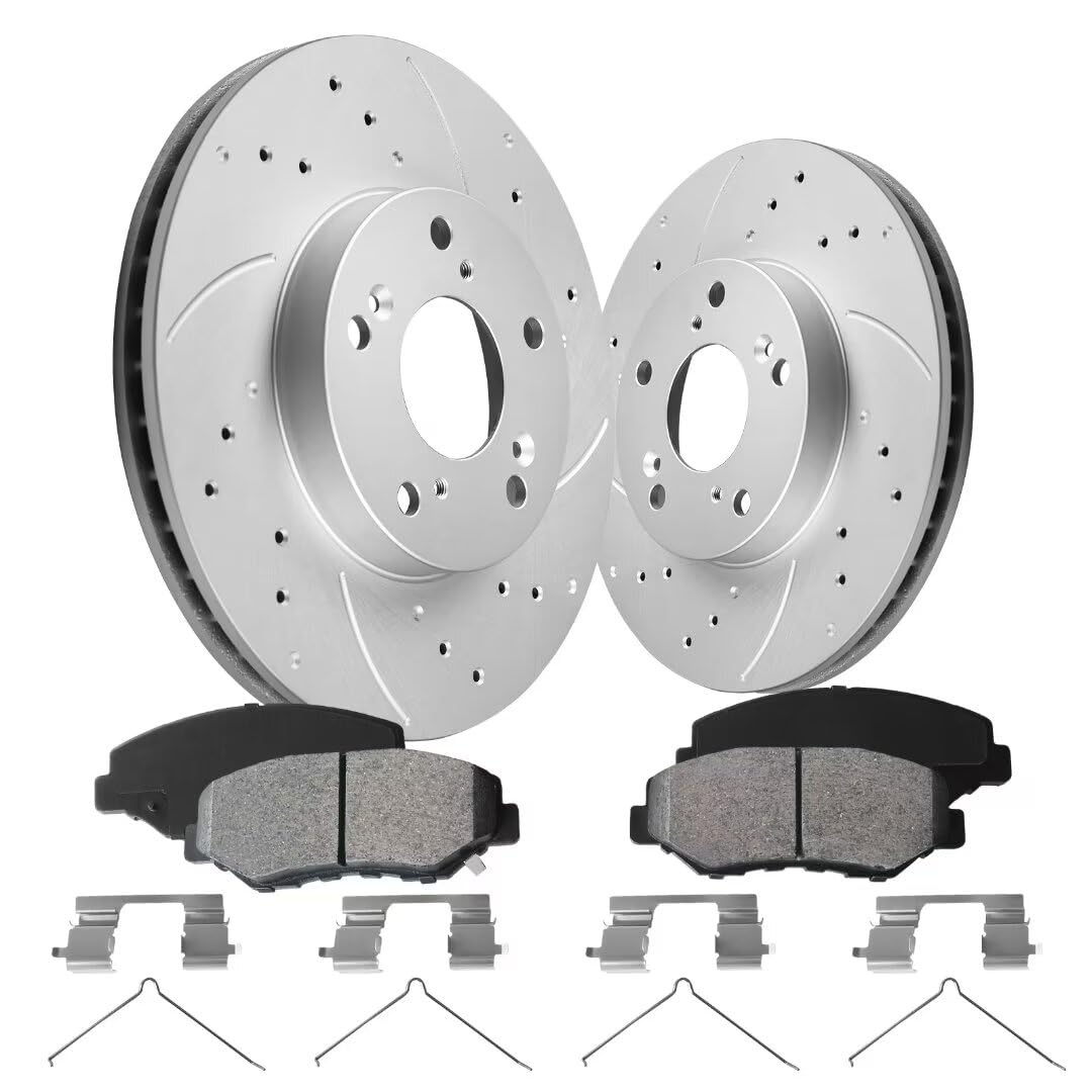 Kit de Freio Frontal para Substituição Automotiva, com Discos Perfurados e Ranhurados, compatível com Honda Accord (2003-2017) e Honda Civic (2013-2015). Possui revestimento Geomet anti-ferrugem, garantindo durabilidade e resistência à corrosão. Com diâmetro de 281,9 mm (11,1 in), oferece melhor desempenho de frenagem e dissipação de calor, aumentando a segurança e a eficiência do veículo. Ideal para quem busca qualidade e confiabilidade na manutenção do sistema de freios.