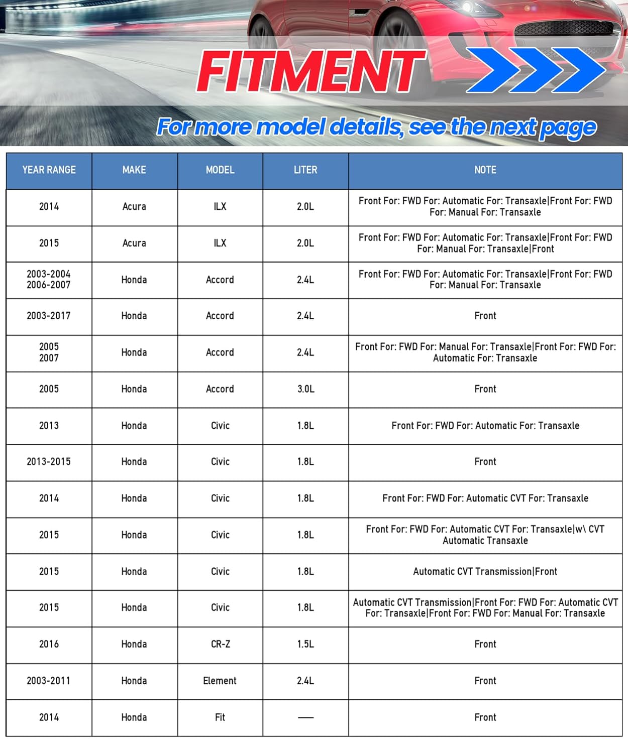 – Honda Accord: 2003-2007 (2.4L), 2008 (LX ou LX-P), 2009-2010 (LX, LX-P, LX-S), 2011-2012 (LX, LX-P, LX-S, SE), 2014-2015 (LX, LX-S; 2.4L), 2016-2017 (LX).