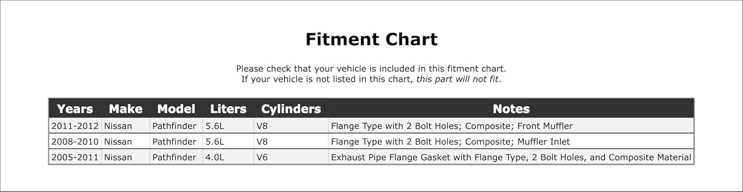 Resposta: Sim, esta gaxeta de flange do tubo de escape é compatível com Nissan Pathfinder dos anos 2005 a 2012, incluindo o modelo de 2010.
