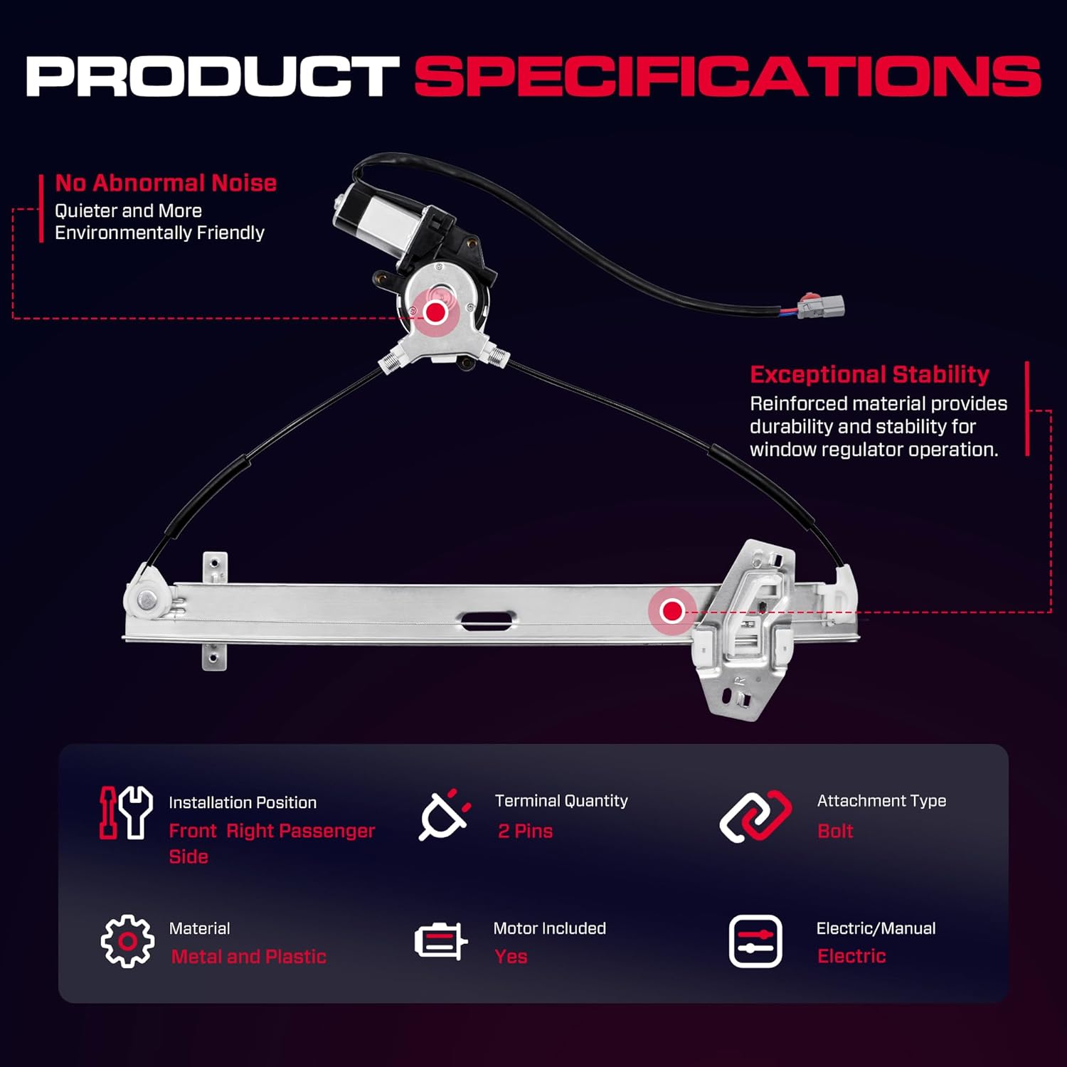 - Número OEM: O conjunto do regulador de janela e motor do lado do passageiro é compatível com os números OEM 748-130, 72210-S9V-A01, 72210-S9V-A02, HO1351127, WL44158, 11A396, 660119, 125-58995R. Este produto é exclusivo para veículos equipados com motor de 2 pinos.