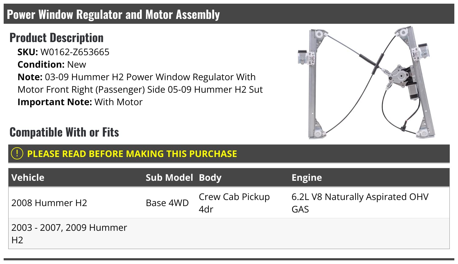 10 avaliações para Regulador de Vidro Elétrico Frontal Direito com Motor – Compatível com Hummer H2 2003-2009 4WD Crew Cab Pickup 4-Portas 6.2L V8 Gasolina