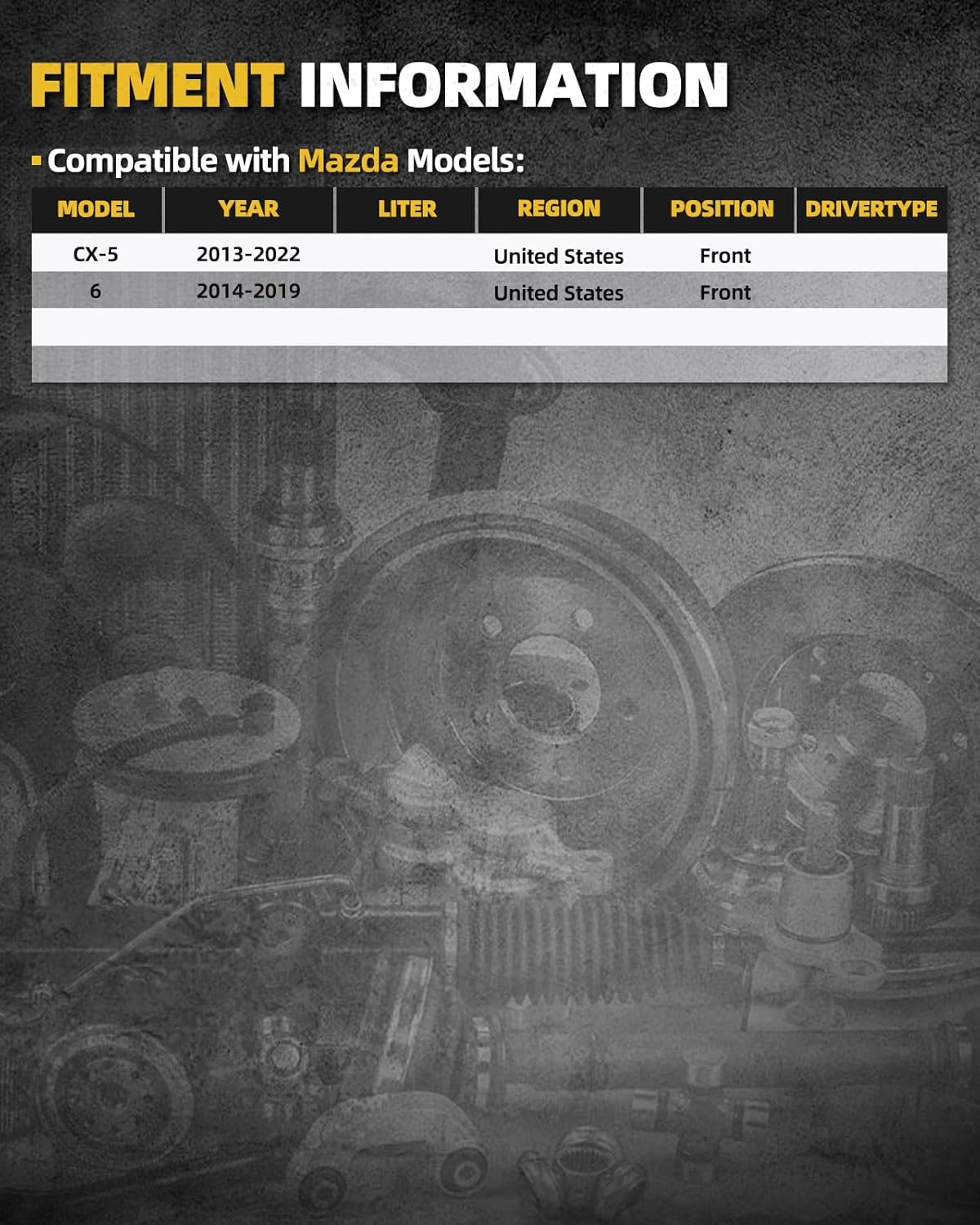 – CX-5 FWD: 2013, 2014, 2015, 2016, 2017, 2018, 2019, 2020, 2021, 2022