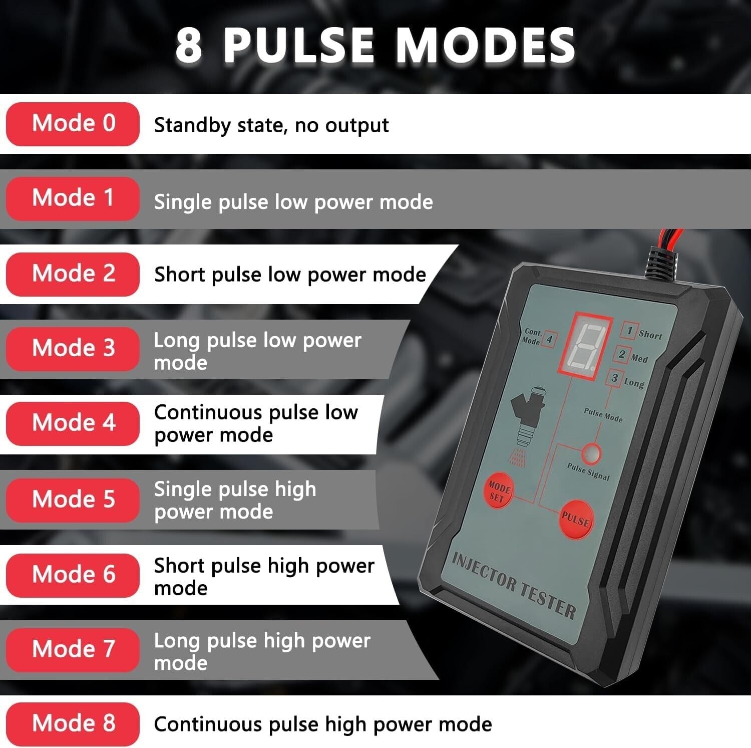 • 🚕 8 Modos de Pulso e Múltiplas Potências de Saída: O nosso kit de testador de injetores apresenta 8 modos de pulso, incluindo modos de pulso curto, médio, longo e contínuo, além de opções de potência de saída de 12V e 5V. Isso o torna compatível tanto com injetores EFI quanto GDI, tornando-o uma ferramenta versátil e poderosa para qualquer tarefa relacionada a injetores.