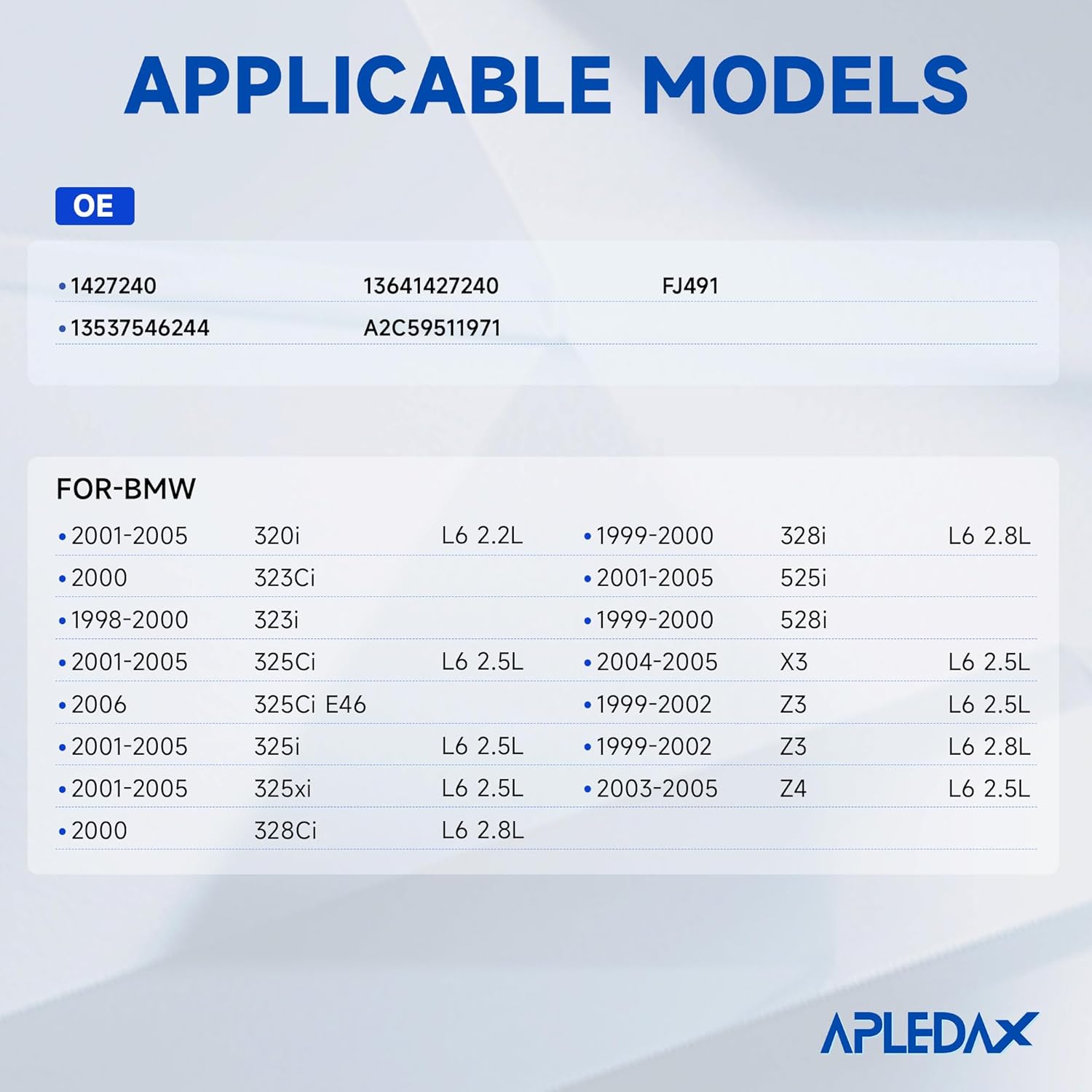 • Compatibilidade: Este conjunto é compatível com os seguintes modelos: BMW 320i (2001-2005 L6 2.2L), 323Ci (2000), 323i (1998-2000), 325Ci (2001-2005 L6 2.5L), 325i (2001-2005 L6 2.5L), 325xi (2001-2005 L6 2.5L), 328Ci (2000 L6 2.8L), 328i (1999-2000 L6 2.8L), 525i (2001-2005), 528i (1999-2000), X3 (2004-2005 L6 2.5L), Z3 (1999-2002 L6 2.5L/2.8L) e Z4 (2003-2005 L6 2.5L).