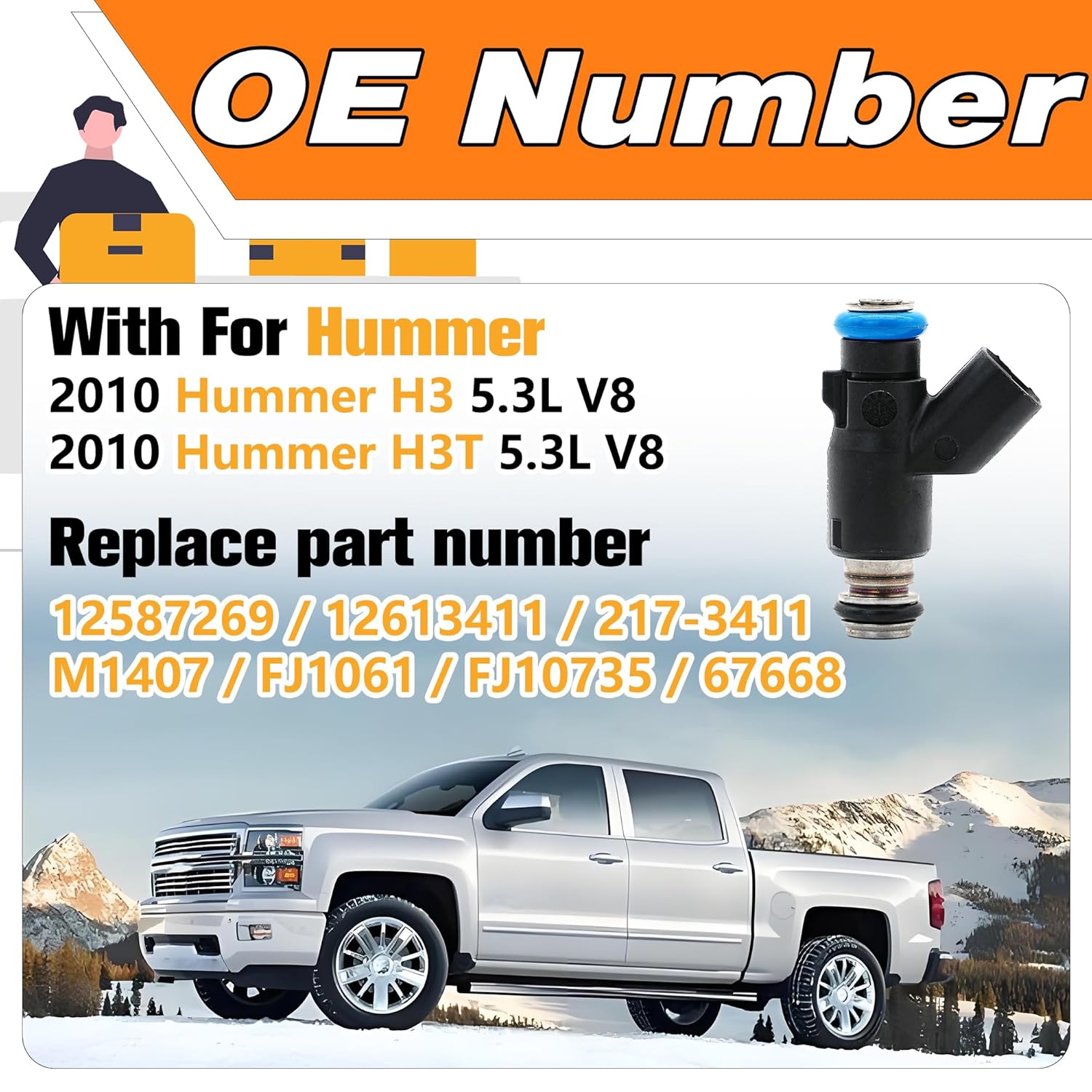 - Compatibilidade: Estes injetores são compatíveis com uma ampla gama de veículos, incluindo o Chevy Avalanche 5.3L V8 (2010-2013), Chevy Suburban 1500 5.3L V8 (2010-2014), Chevy Express 1500 5.3L V8 (2010-2014), e muitos outros modelos da linha Chevy e GMC, como o Hummer H3 5.3L V8 (2010).