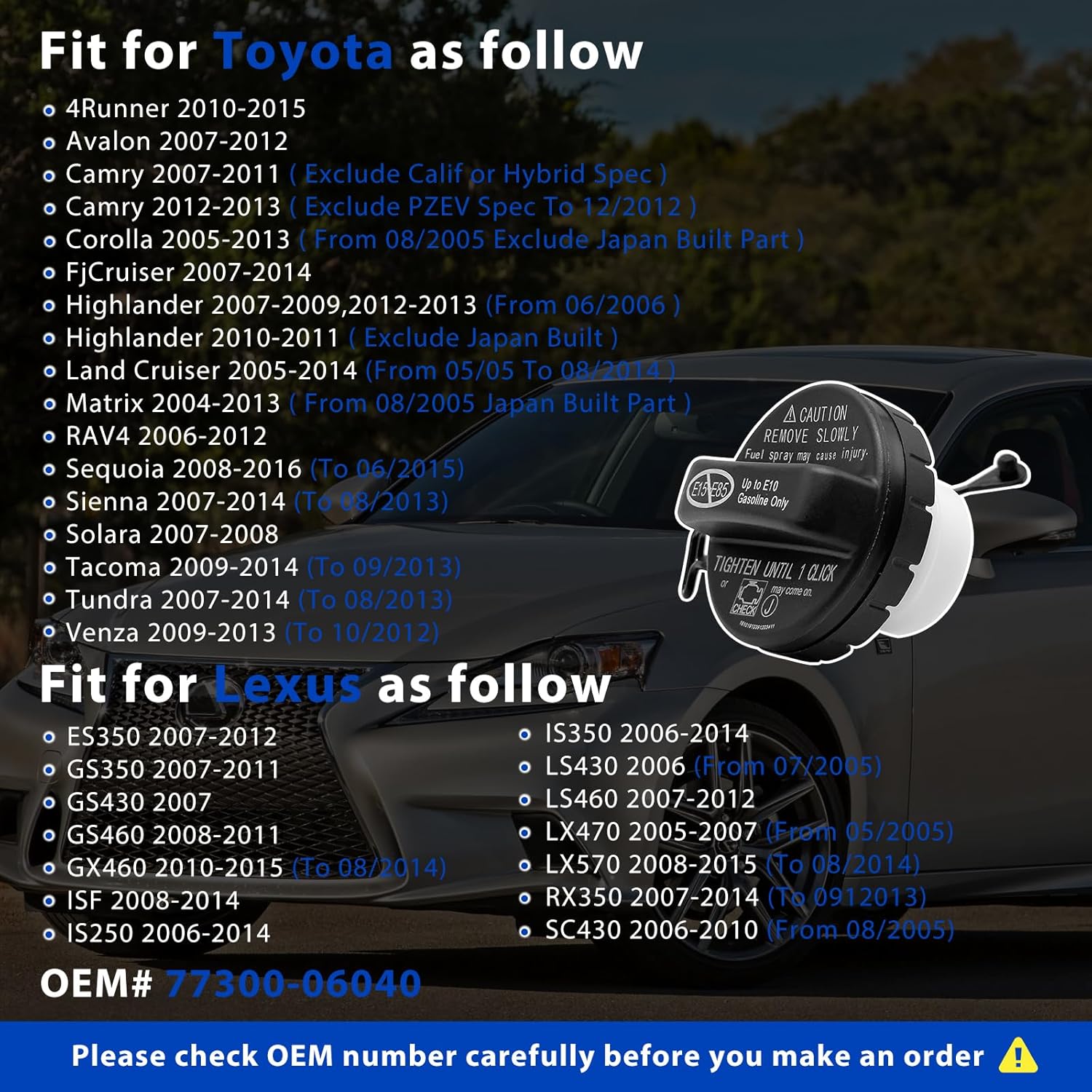 Resposta: A tampa do tanque de combustível 77300-06040 é compatível com diversos modelos Toyota e Lexus. Consulte a lista de compatibilidade acima para verificar se seu veículo está incluído.