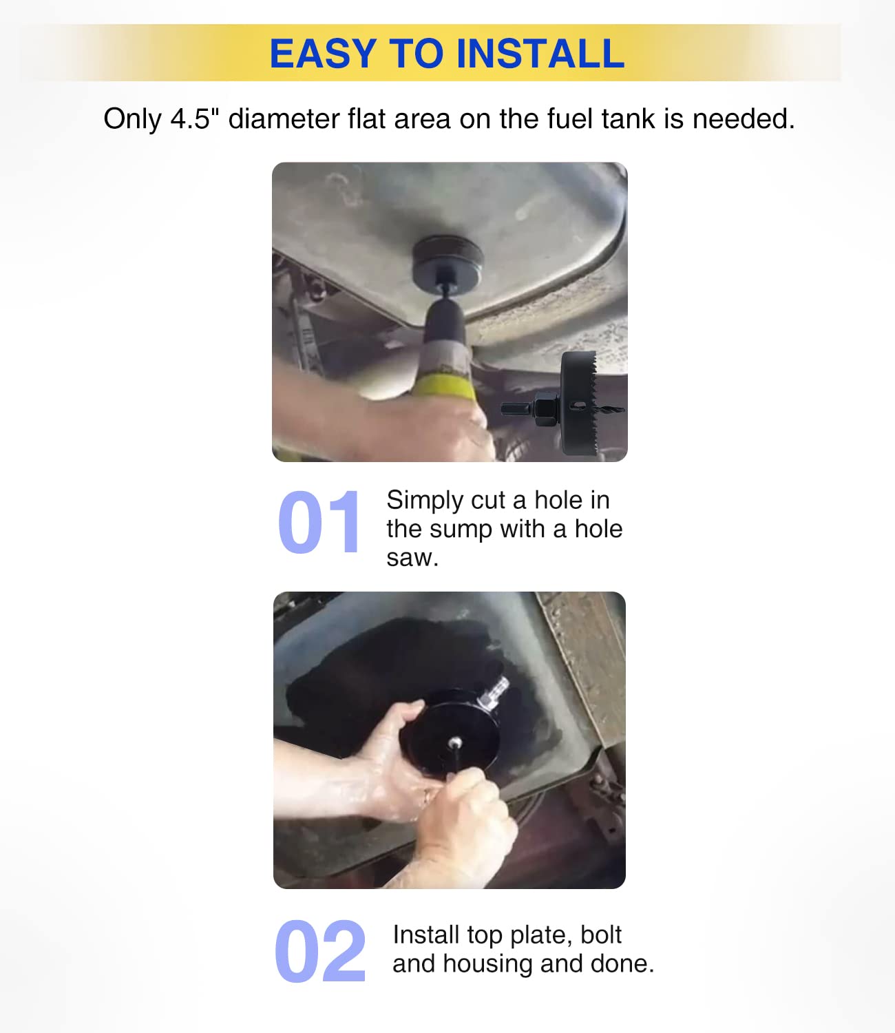 A instalação do kit é simples e rápida, exigindo apenas uma área plana de 4,5 polegadas de diâmetro no tanque de combustível. Após drenar o combustível, você pode realizar a instalação em cerca de 10 minutos, utilizando uma serra copo para cortar o buraco no sump, seguido da instalação da placa superior, parafuso e carcaça.