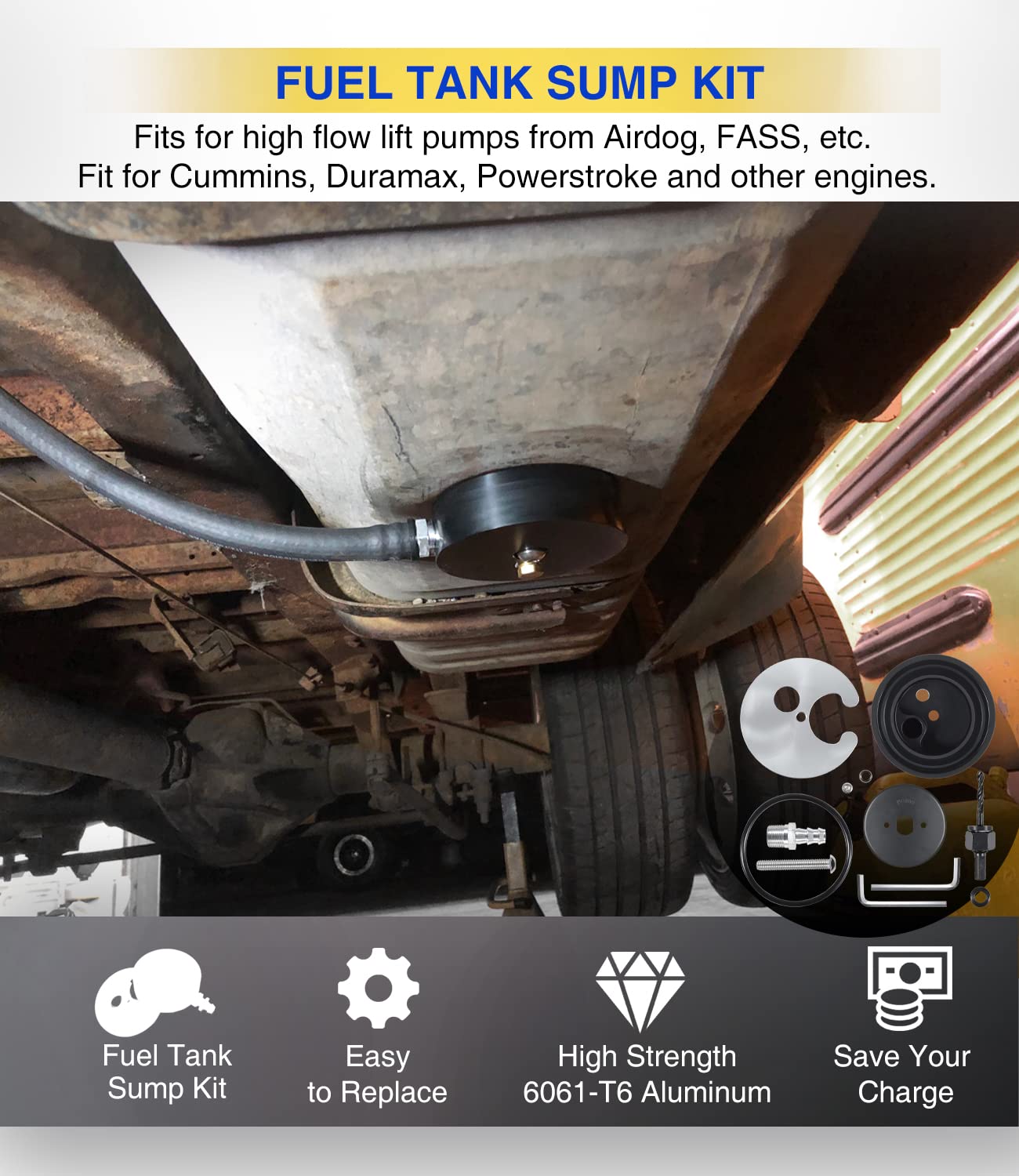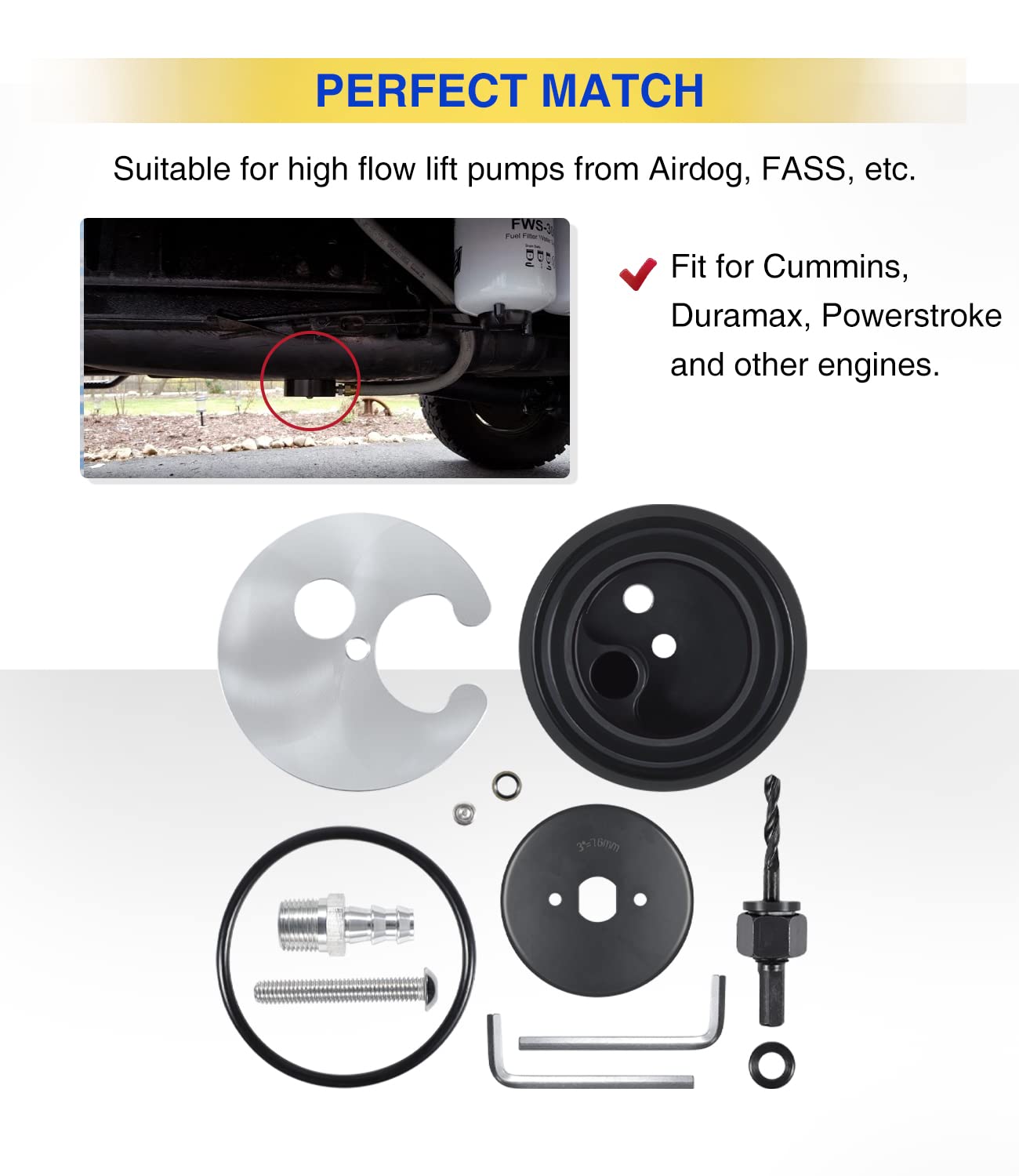 ### Descrição do Produto: Kit de Sump de Tanque de Combustível para Bombas FASS Airdog Fuelab, Compatível com Motores Cummins, Powerstroke e Duramax Diesel