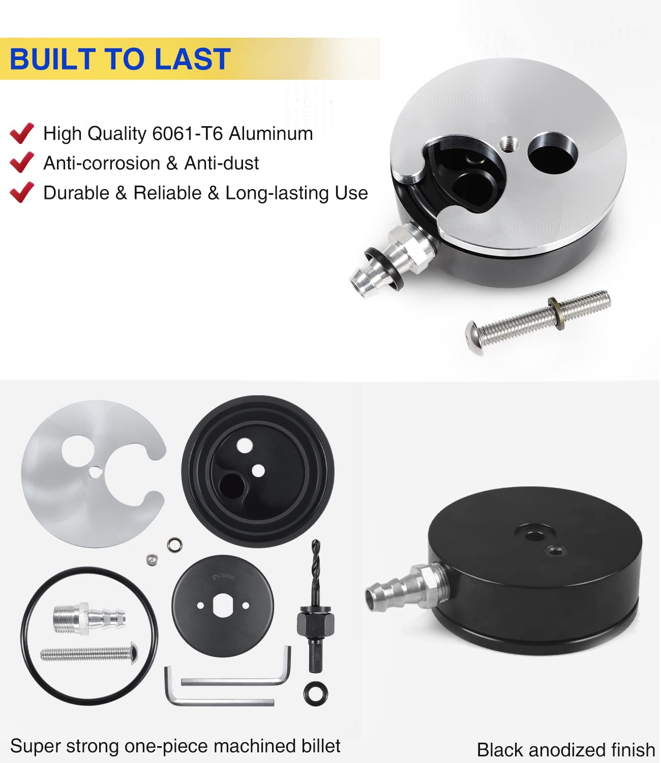O Sump de Tanque de Combustível é fabricado em alumínio 6061-T6 de alta qualidade, com acabamento anodizado preto. Seu design em billet de uma peça única garante resistência e durabilidade, sendo anti-corrosivo e à prova de poeira, ideal para condições adversas.