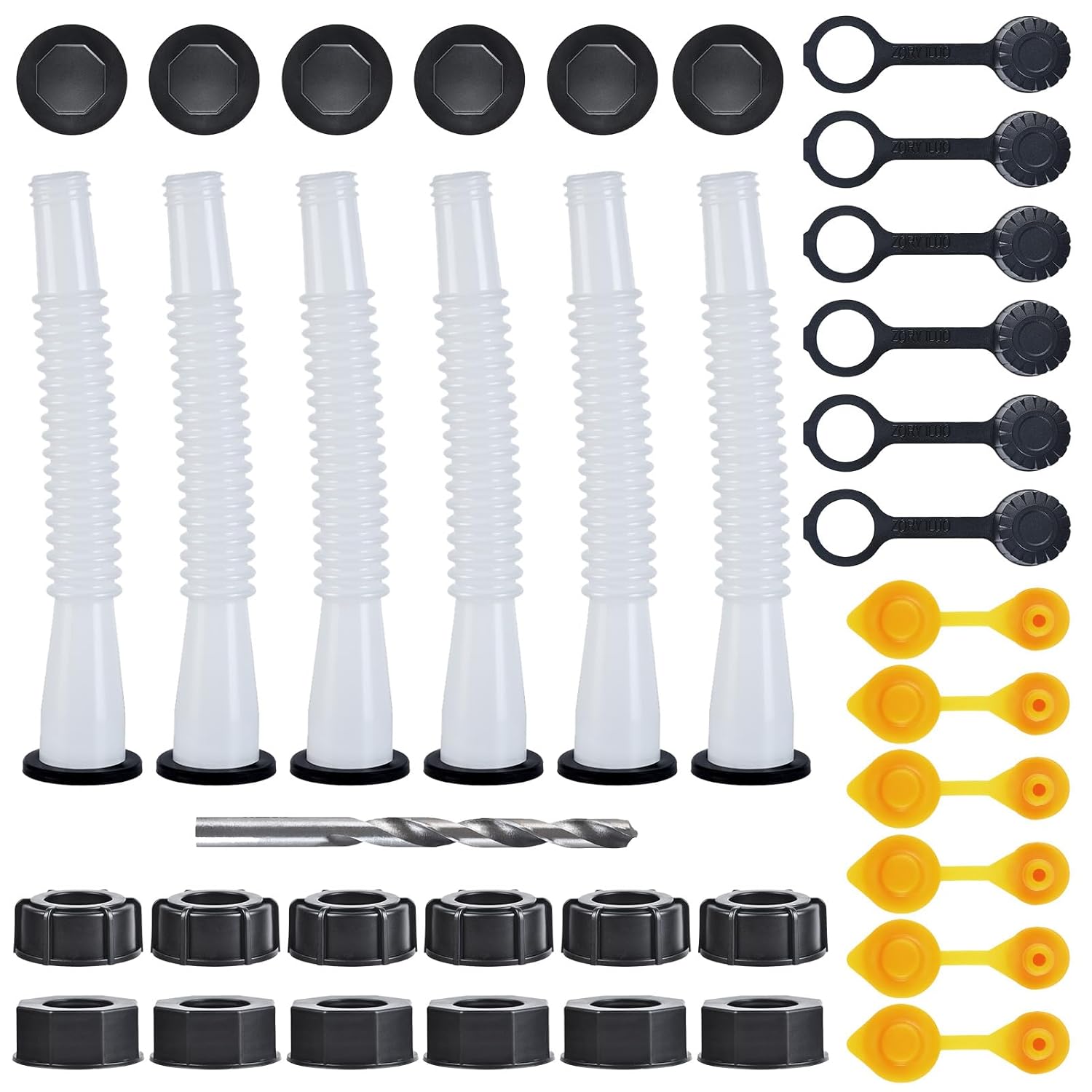The top-hat looking caps twist on in order to get a better seal on the spout. What makes this kit better than others I have bought and tried is that the plastic for the nozzles is pretty thick. With others, the plastic was very thin, and when I would try to use them, the weight of the gas can would flatten the nozzle and deform to the point that they would split open or squeeze the hose enough to prevent flow. The gaskets on the others were also weak and cheap, breaking on the first use, and would leak gas everywhere too. The rubber on these gaskets are pretty strong and I have not experienced any breaks, deformities, or wear yet. No leaks either. So while you get more stuff for less for other kits, the quality just isn’t there and they’ll be useless to you, especially so on bigger cans.