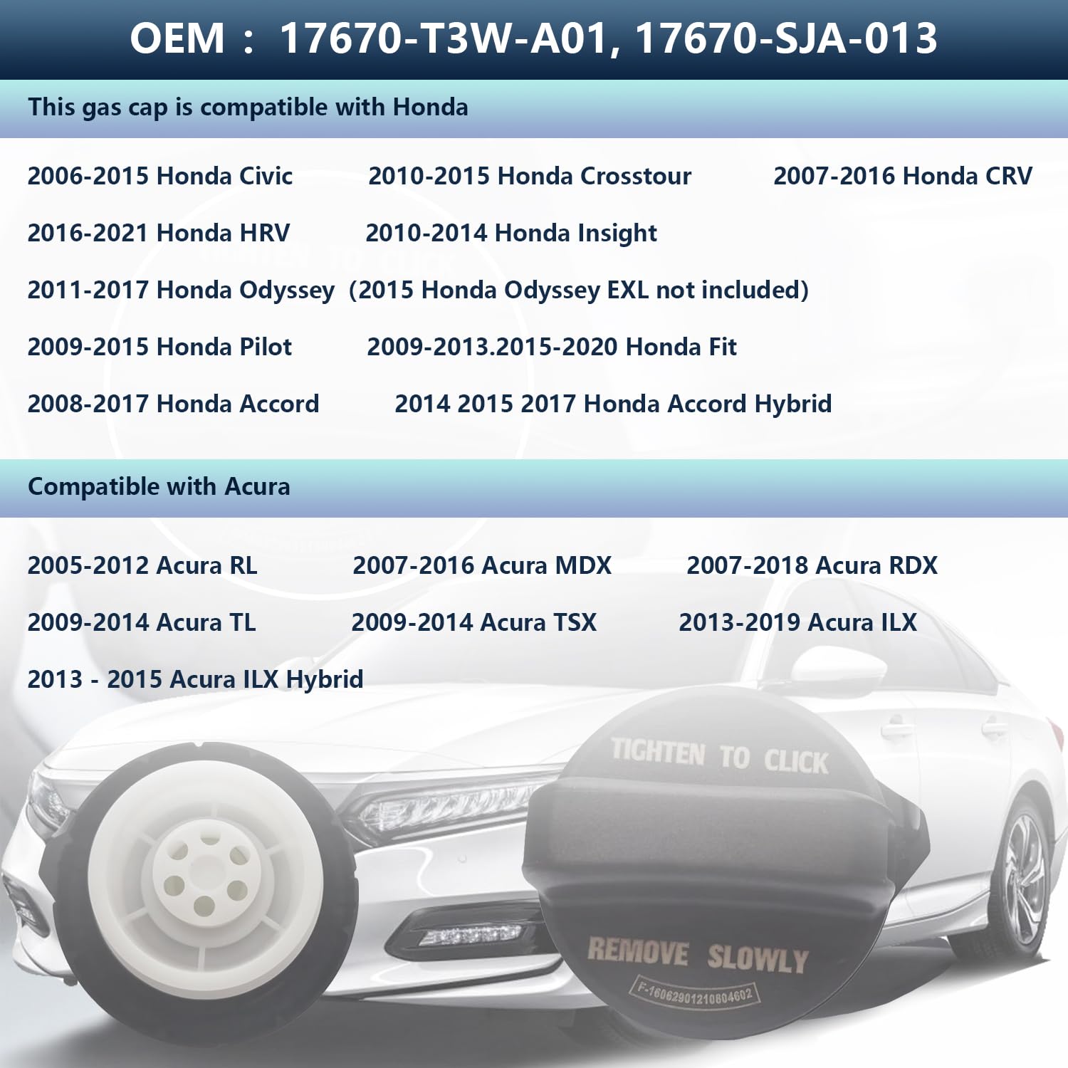 A tampa de combustível 17670-T3W-A01 é a solução ideal para quem busca um substituto confiável e de alta qualidade para os modelos de veículos Honda e Acura. Compatível com uma ampla gama de carros, incluindo o Honda Accord (2008-2017), Honda Pilot (2009-2015), Honda Civic (2006-2015), Honda CR-V (2007-2016), Honda Fit (2009-2020), Honda Odyssey (2011-2017), Honda HR-V (2016-2020) e Honda Insight (2010-2014), esta tampa é projetada para atender às exigências de desempenho e durabilidade.