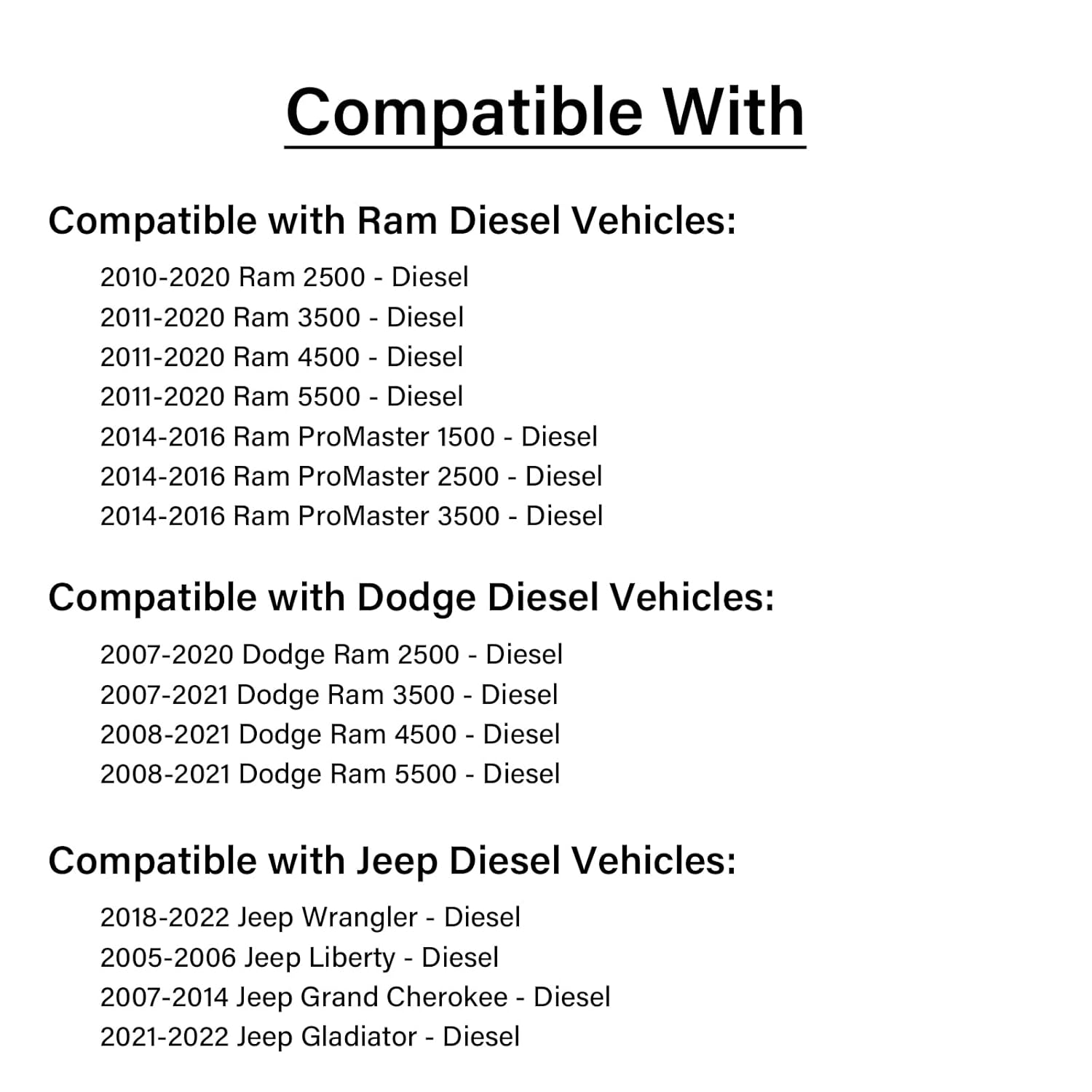- Compatível com Veículos Diesel Dodge & Ram: 2007-2020 Dodge Ram 2500 | 2007-2021 Dodge Ram 3500 | 2008-2021 Dodge Ram 4500 | 2008-2021 Dodge Ram 5500 | 2010-2020 Ram 2500 | 2011-2020 Ram 3500 | 2011-2020 Ram 4500 | 2011-2020 Ram 5500 | 2014-2016 Ram ProMaster 1500 | 2014-2016 Ram ProMaster 2500 | 2014-2016 Ram ProMaster 3500.