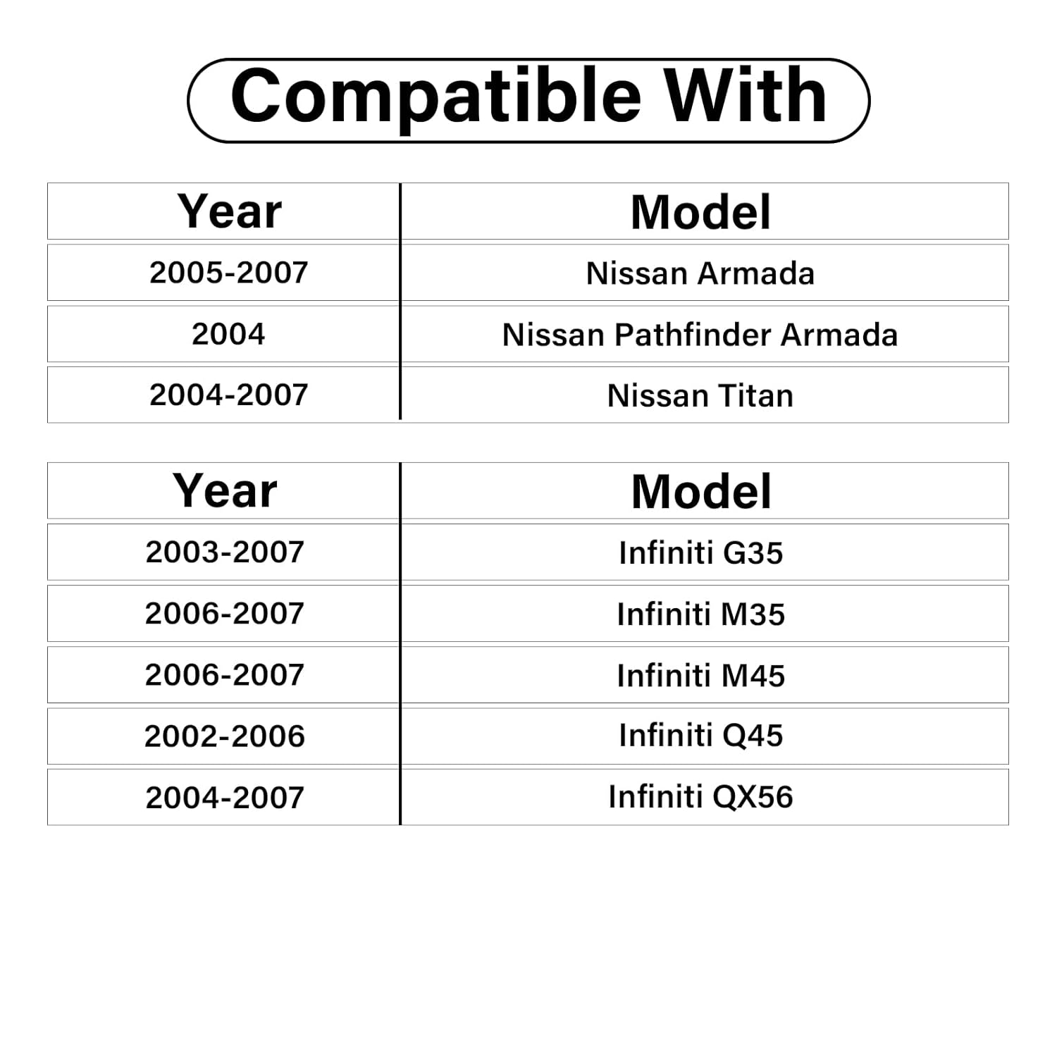 • Compatível com Nissan e Infiniti: Para Nissan 2005, 2006, 2007 Armada | 2004 Pathfinder Armada | 2004, 2005, 2006, 2007 Titan; para Infiniti 2003, 2004, 2005, 2006, 2007 G35 | 2006, 2007 M35 | 2006, 2007 M45 | 2002, 2003, 2004, 2005, 2006 Q45 | 2004, 2005, 2006, 2007 QX56.