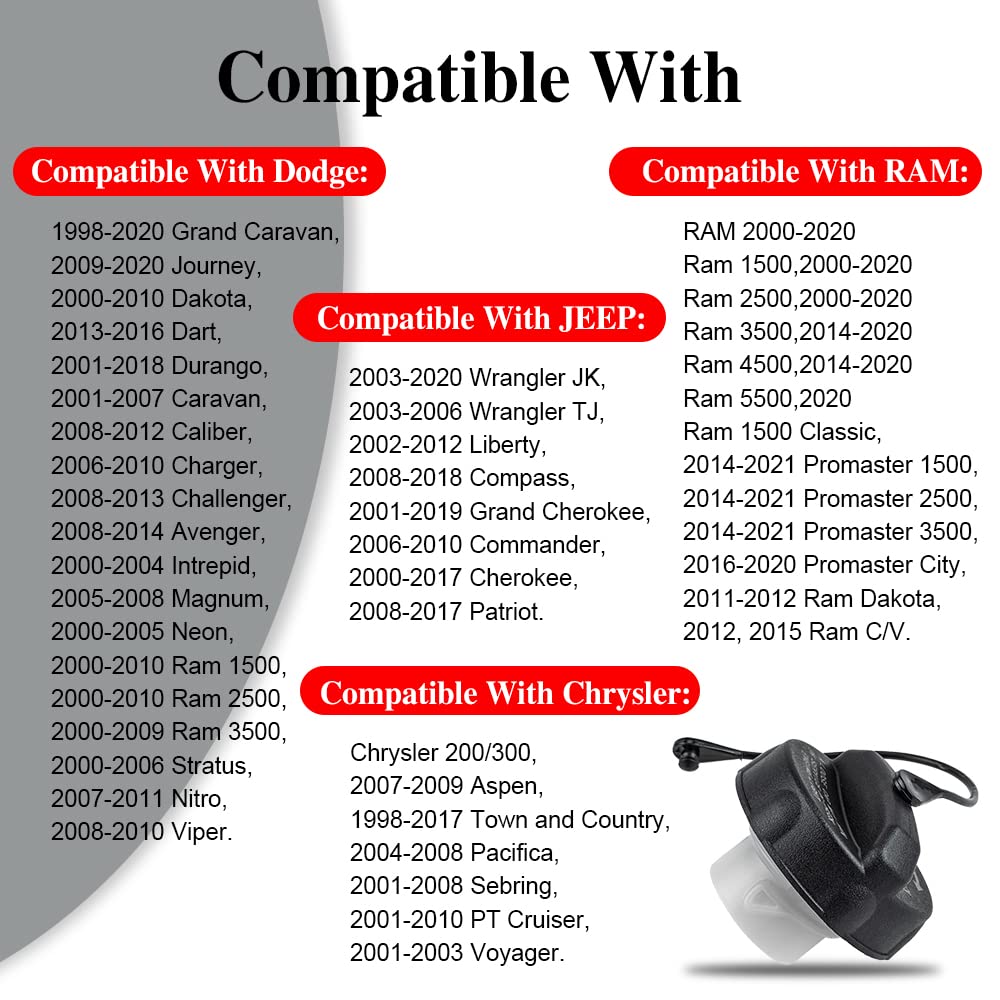 - Compatível com Ram & Chrysler: A tampa de combustível se encaixa em diversos modelos da RAM, como Ram 1500, 2500, 3500 (2000-2020), além de Promaster e Town & Country (1998-2017). Para Chrysler, é compatível com modelos como 200, 300, Aspen e Pacifica, entre outros.