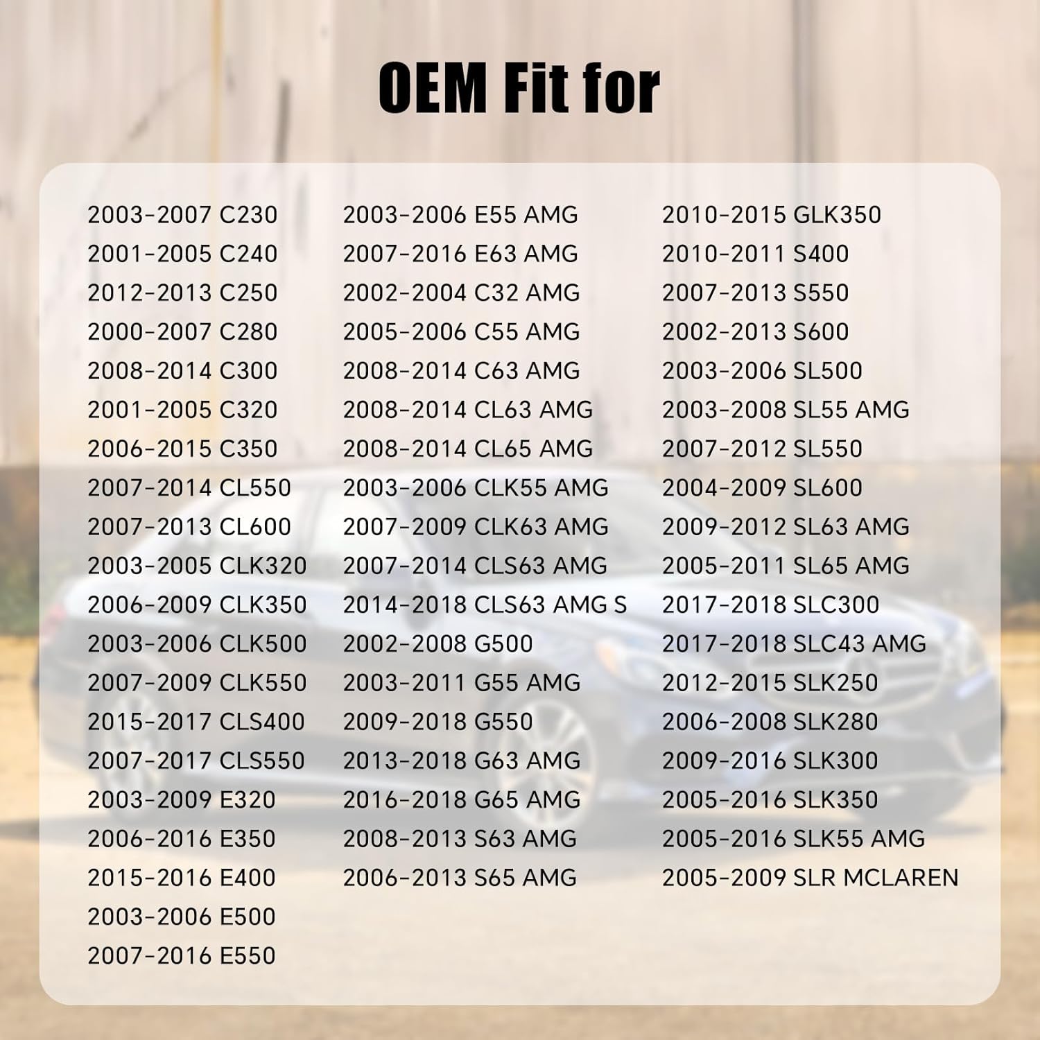 – C Class: 2003-2007 C230, 2001-2005 C240, 2012-2013 C250, 2000-2007 C280, 2008-2014 C300, 2002-2004 C32 AMG, 2001-2005 C320, 2006-2015 C350, 2005-2006 C55 AMG, 2008-2014 C63 AMG.