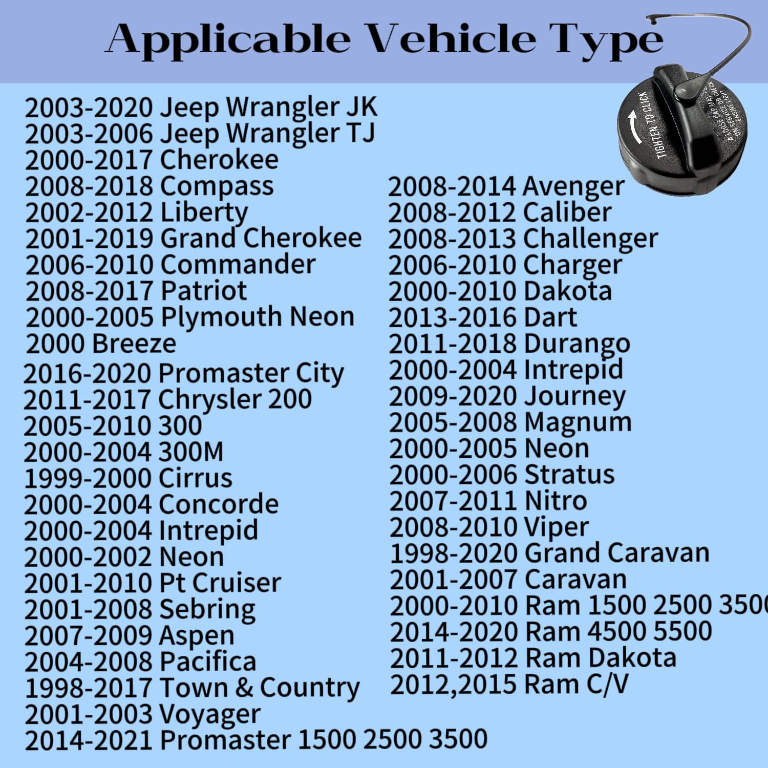 – FIT FOR RAM & CHRYSLER: A tampa de combustível é compatível com Ram 1500, 2500, 3500, 4500, 5500, C/V, Promaster 1500, 2500, 3500, Promaster City, Ram Dakota, além de diversos modelos Chrysler como 200, 300, 300M, Cirrus, Concorde, Intrepid, Neon, Pt Cruiser, Sebring, Aspen, Pacifica, Town & Country e Voyager.