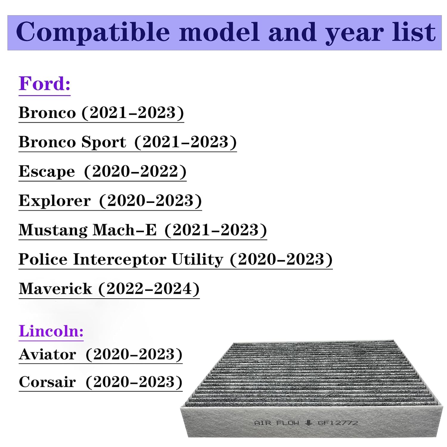 Filtro de Ar da Cabine GF12772 para Ford Bronco 2021-2023, Bronco Sport, Mustang Mach-E, Explorer 2020-2023, Police Interceptor Utility, Escape 2020-2022, Maverick 2022-2024, Lincoln e mais