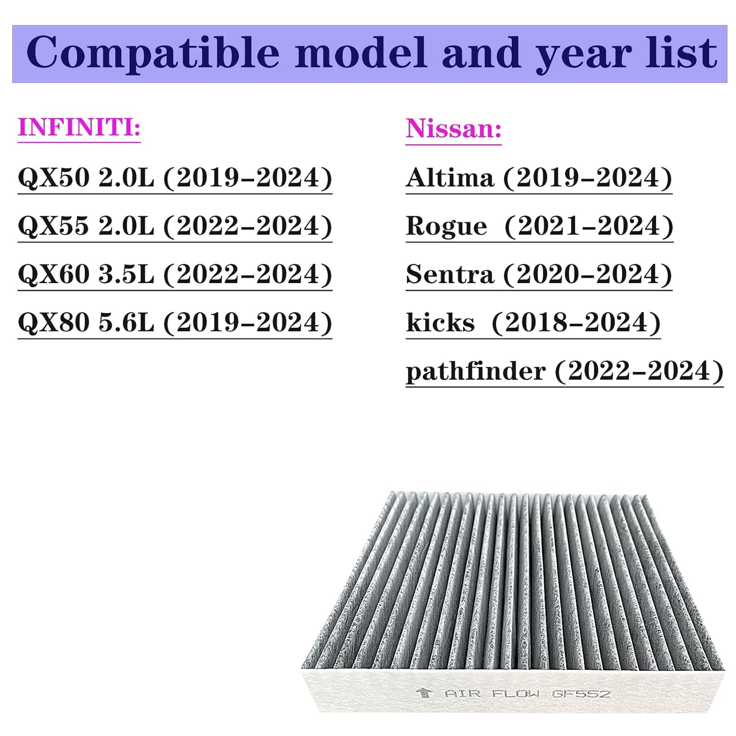 O Filtro de Ar do Cabine GF552 é a solução definitiva para quem prioriza a qualidade do ar que respira dentro do veículo. Com compatibilidade garantida para uma vasta gama de modelos, incluindo os luxuosos INFINITI QX50 (2019-2024), QX55 (2022-2024), QX60 (2022-2024), QX80 (2019-2024), além dos populares Nissan Altima (2019-2024), Rogue (2021-2024), Sentra (2020-2024), Kicks (2018-2024) e Pathfinder (2022-2024), este filtro assegura um ambiente interno mais saudável, livre de poluentes e alérgenos.