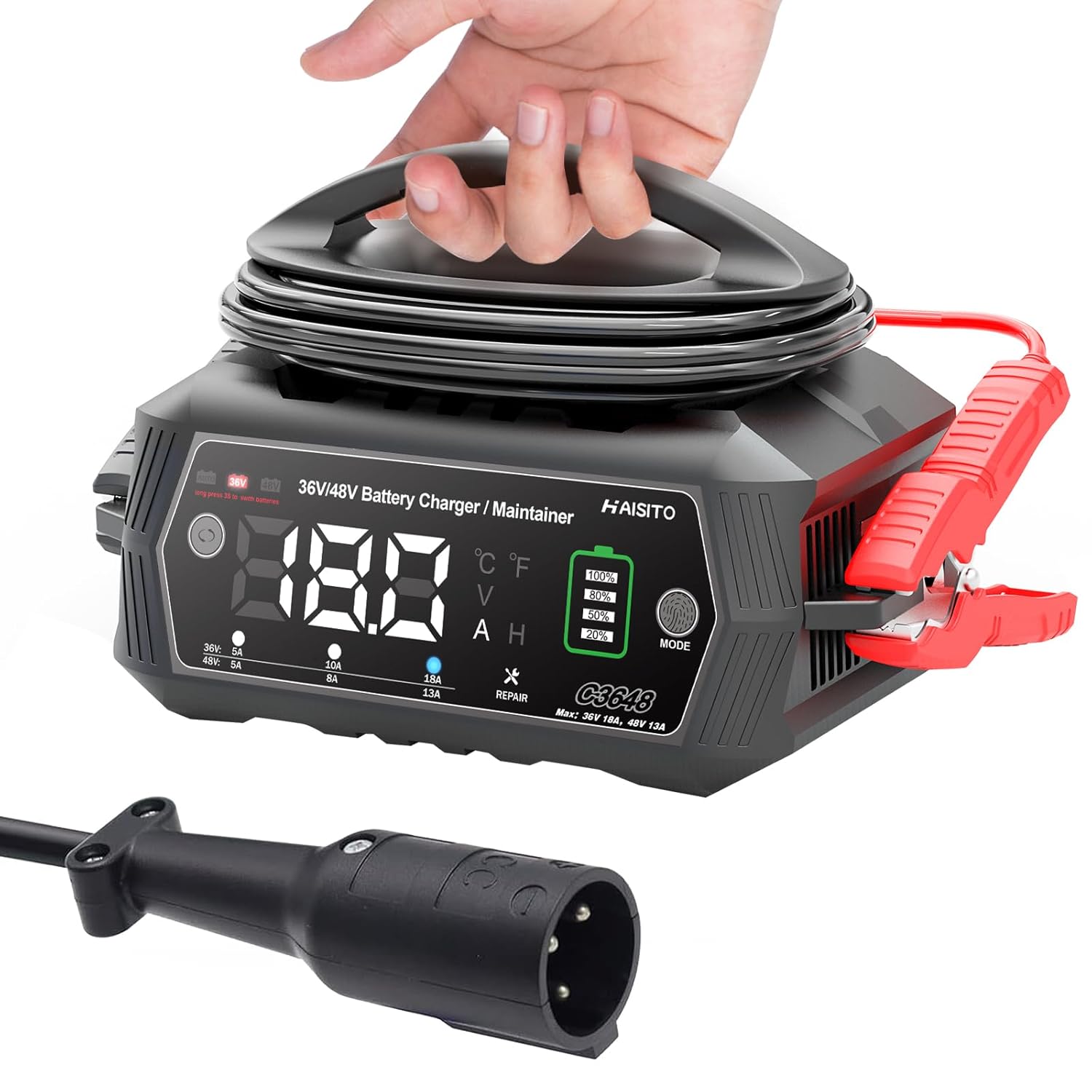 A funcionalidade de carregamento automático permite que o usuário selecione facilmente entre baterias de 36V e 48V. O CPU integrado monitora o processo de carregamento e, ao atingir a carga completa, o dispositivo entra em modo de carga lenta, detectando camadas de sulfato e ácido, utilizando uma função de reparo por pulso para restaurar o desempenho perdido. O carregador também permite ajustar a corrente de carregamento de acordo com a necessidade, podendo chegar a 18A em situações de bateria seriamente descarregada.