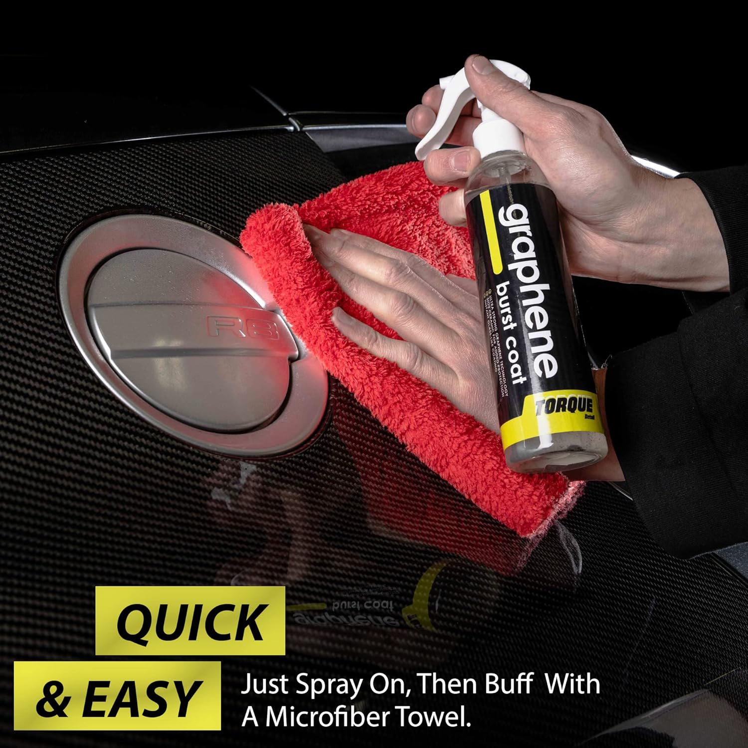 2. Aplicação: Agite bem o frasco antes de usar. Aplique o Graphene Burst Coat em uma área pequena da superfície do carro, utilizando um pano de microfibra limpo e seco. Espalhe uniformemente em movimentos circulares.