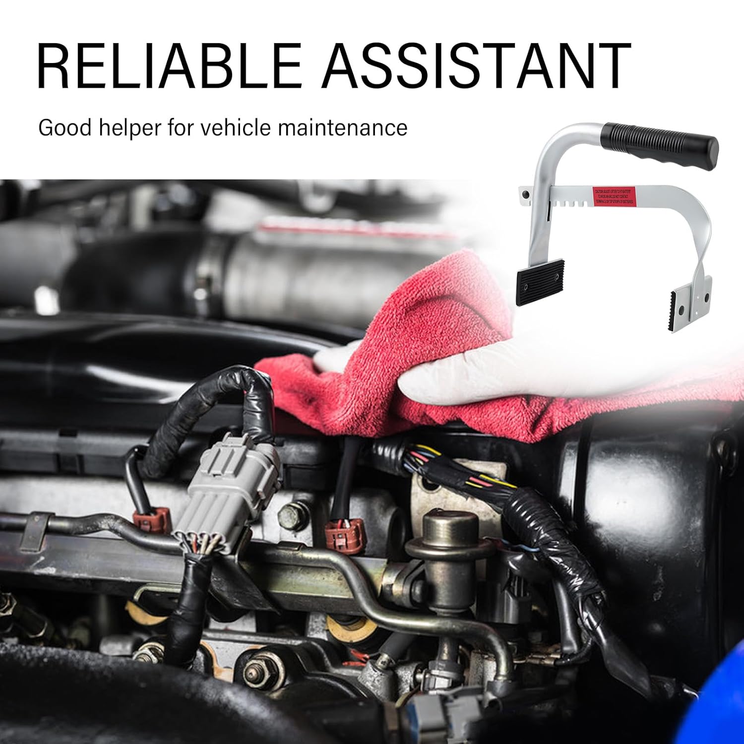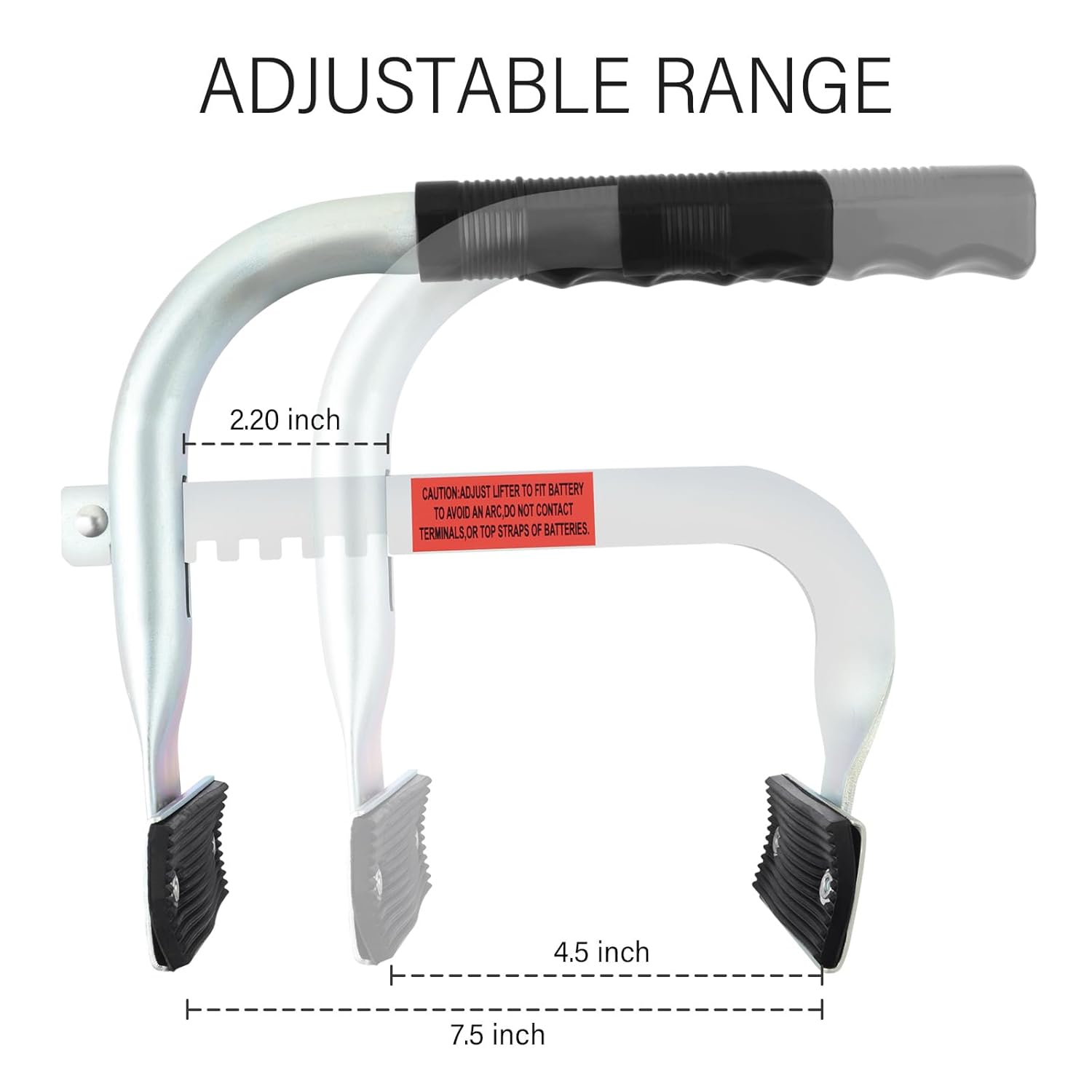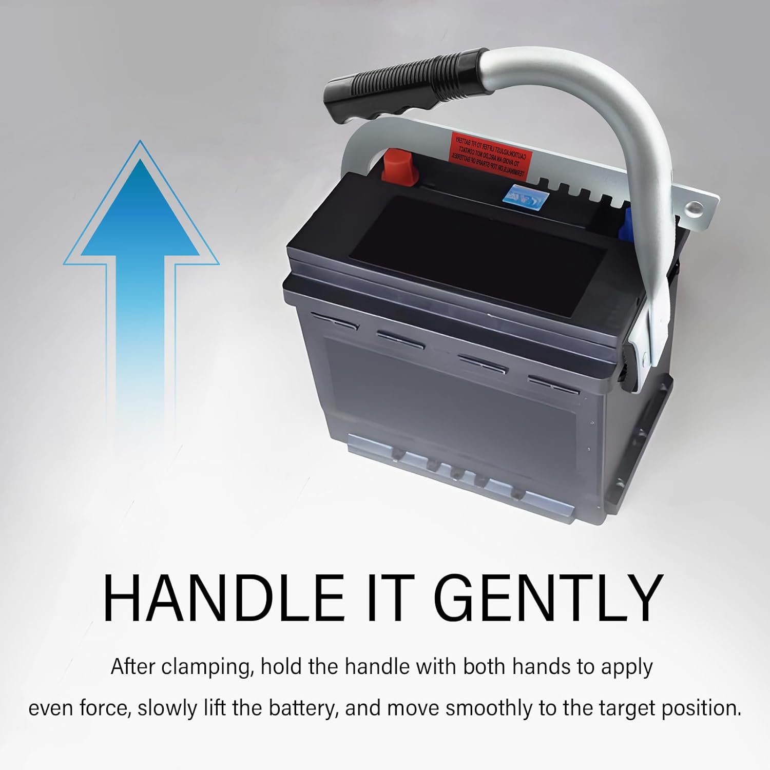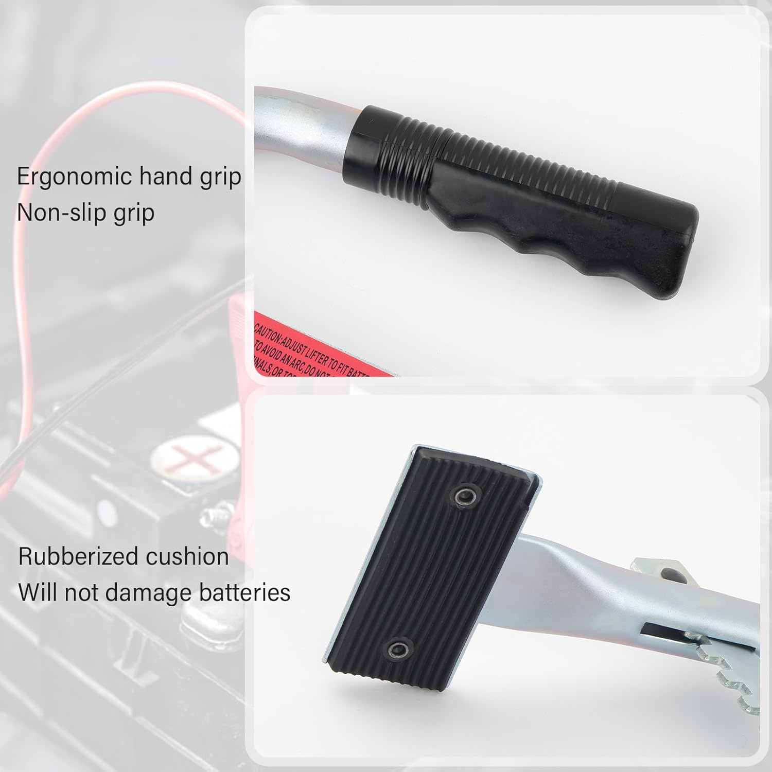 Como Usar: Para utilizar a ferramenta, ajuste o cabo do transportador para a largura de abertura apropriada. Coloque os braços de fixação do cabo em ambos os lados da bateria. Segure o cabo com ambas as mãos para aplicar força de maneira uniforme, levantando lentamente a bateria e movendo-a suavemente para o local desejado.