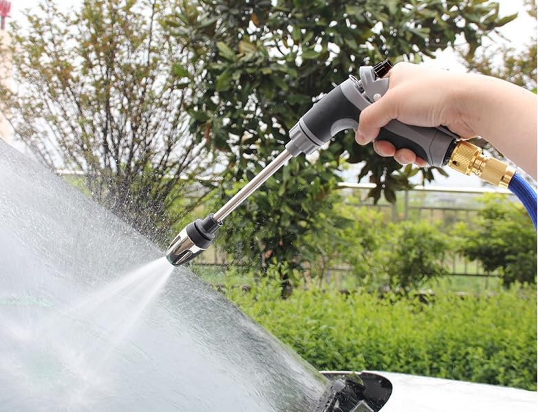 This hose nozzle gun kit is pretty decent. Right off the bat, it’s a great value for all the piece you get. You get an expandable garden hose, the quick connect adapters, teflon tape and even an adapter to put on the end of a hose that doesn’t have threads. The adjustable nozzle tip is fully made of plastic which was misleading from the photos, it was just made to look like metal. The pipe extension is metal though but after using it to wash my car, it is a good theory of an idea but in the end it’s completely unnecessary to have a metal pipe extending 1 ft off of the gun, it didn’t make cleaning my vehicle any easier or better. If anything it made it a bit more work because now I had to manually adjust the nozzle to get a different spray pattern, compared to the spray guns that just have a rotate and click nozzle that has 10 different spray settings ready to go. Overall, this a good kit if you literally have nothing to start out with.