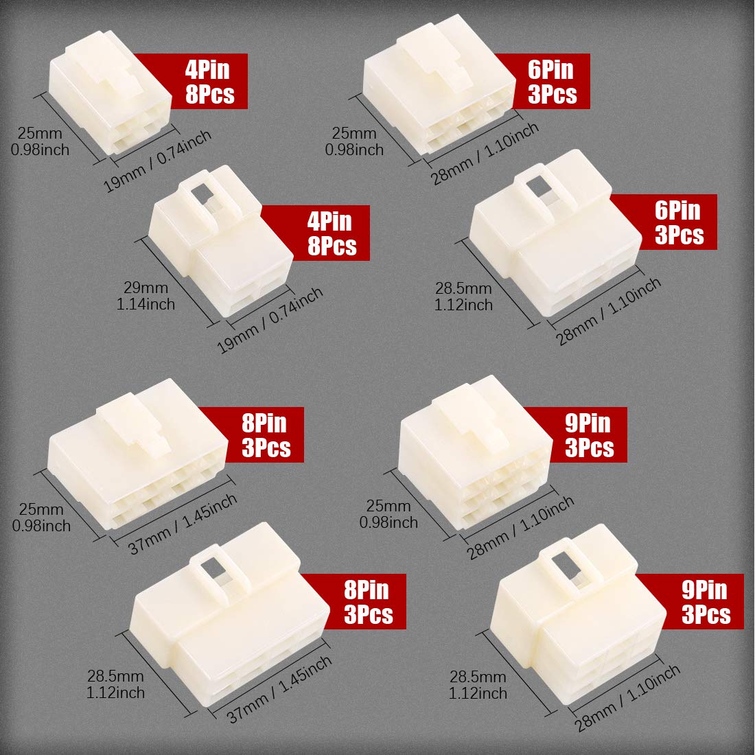 I like the quality of the plastic connectors and terminals for a great price. I had a voltage regulator malfunction and melted the factory connectors and wires. I was able to cut the heated wire back, except one I spliced, and used these connectors. After completing the wire install the connectors went together and locked with a snap that seemed easier and better than OEM.