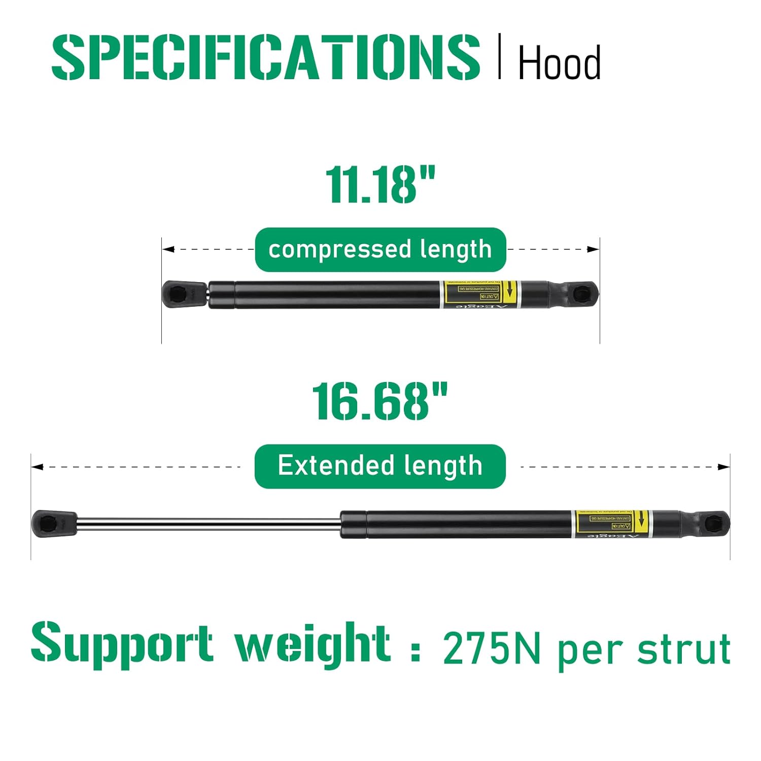 - Especificações: Comprimento estendido: 16.68″, comprimento comprimido: 11.18″, capacidade de suporte: 275N por strut.