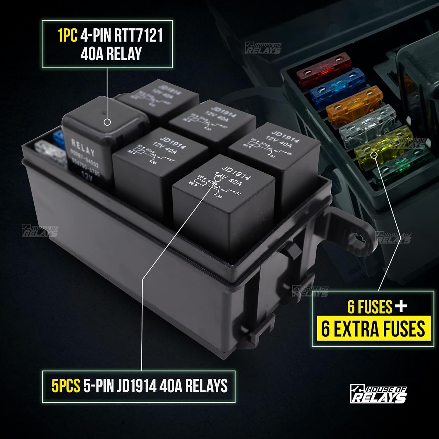 A caixa de relés híbrida universal 12V da House of Relays é a solução ideal para quem busca eficiência e segurança em sistemas elétricos automotivos e marinhos. Este kit completo é equipado com um relé de 5 pinos JD1914 de 40A e um relé de 4 pinos RTT7121 de 12V 40A, além de 12 fusíveis de lâmina ATC/ATO, tornando-o perfeito para uma ampla gama de aplicações em veículos, como SUVs, UTVs, ATVs, trailers, barcos e muito mais.