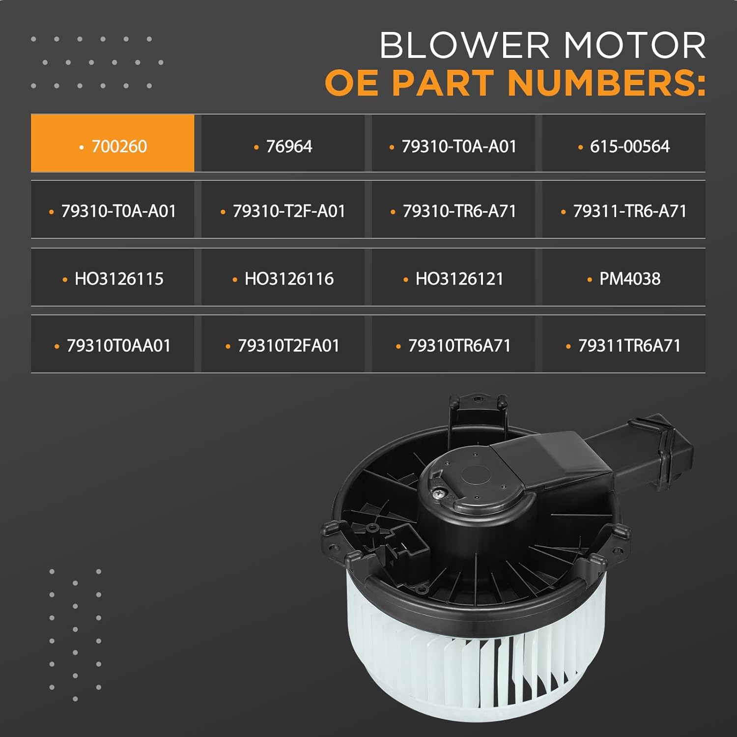 O Motor de Ventilador A/C possui os seguintes números de peça OE: 700260, 76964, 79310-T0A-A01, 79310-T2F-A01, 79310-TR6-A71, 79311-TR6-A71, HO3126115, HO3126116, HO3126121, PM4038, 79310T0AA01, 79310T2FA01, 79310TR6A71, 79311TR6A71. Esses números garantem que você está adquirindo uma peça de reposição de alta qualidade e compatível.