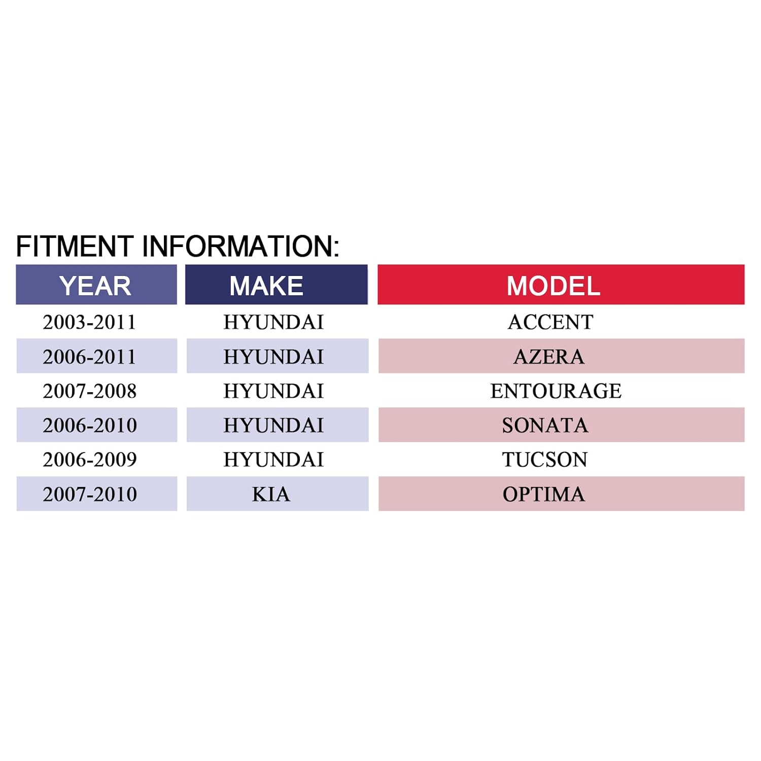 – Compatibilidade: Hyundai Accent (2003-2011), Hyundai Azera (2006-2011), Hyundai Entourage (2007-2008), Hyundai Tucson (2006-2009), Kia Optima (2007-2010).