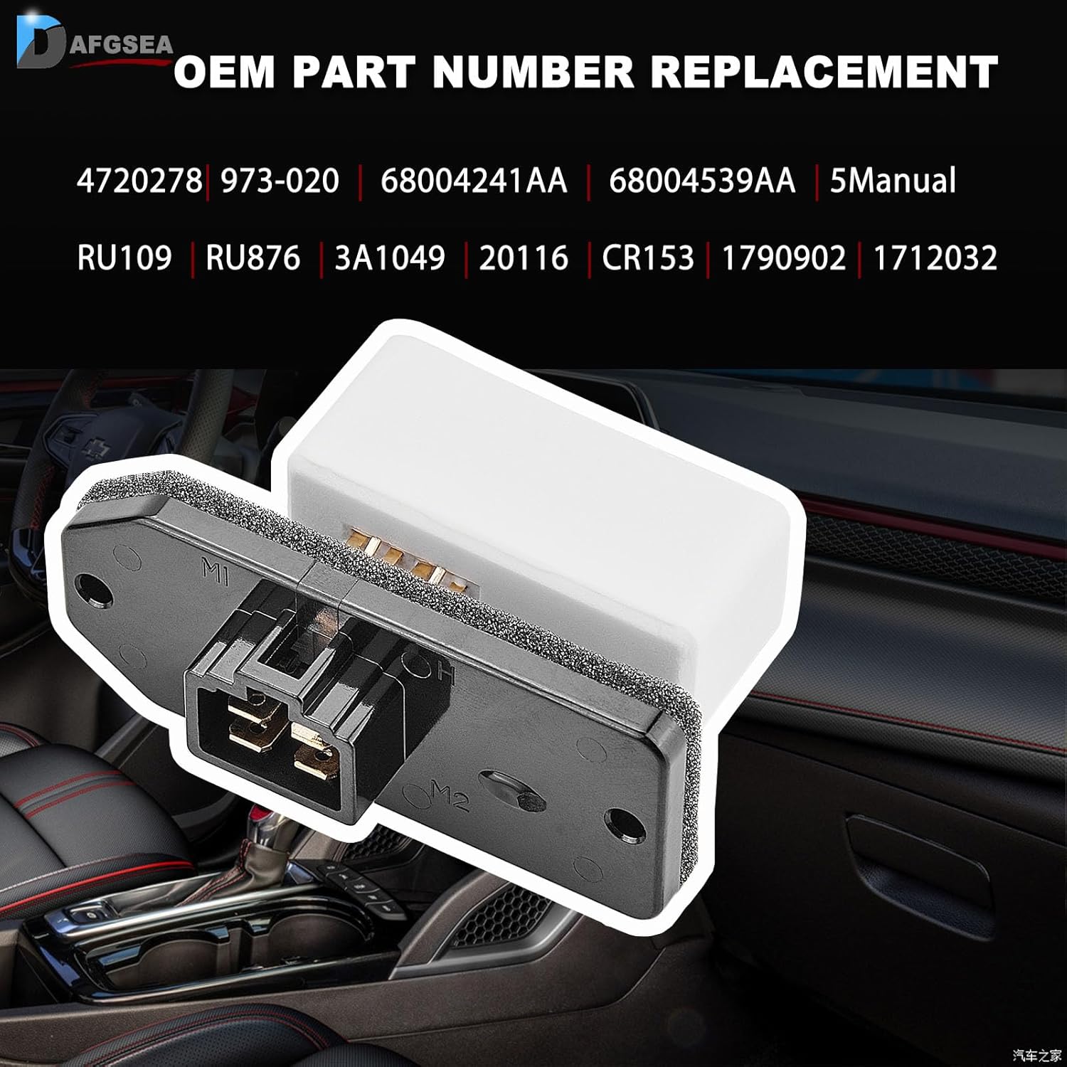- ✅ Números OEM Compatíveis: 4720278, 973020, 68004241AA, 5012212AA, 1712032, 3A1049, 20116, CR153, RU109, RU876, 1790902. Nota: Verifique a descrição ou utilize a barra de seleção de ano/marca/modelo e números de peças intercambiáveis para confirmar a compatibilidade antes de adquirir o Resistor do Motor do Ventilador.