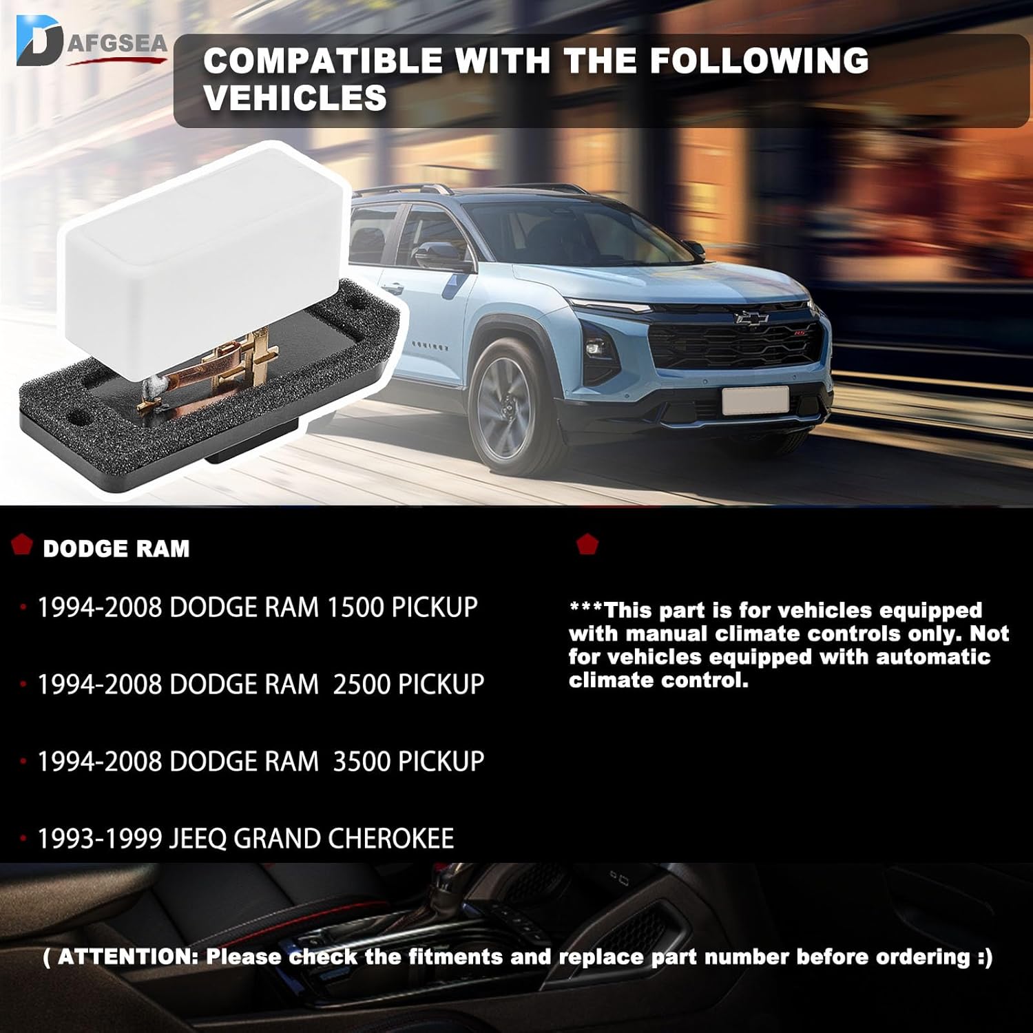- ✅ Veículos Compatíveis: Este Resistor do Motor do Ventilador é destinado a controles de AC manuais, sendo compatível com Jeep Grand Cherokee (1993-1999) e Dodge Ram (1994-2008) nas versões 1500, 2500 e 3500.