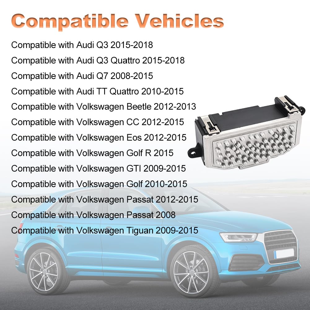 • Modelos Aplicáveis: O resistor do motor do ventilador HVAC é compatível com Audi Q3/Q3 Quattro 2015-2018, Q7 2008-2015, TT Quattro 2010-2015. Compatível com Volkswagen Beetle 2012-2013, CC/Eos 2012-2015, Golf R 2015, GTI 2009-2015, Golf 2010-2015, Passat 2008/2012-2015, Tiguan 2009-2015.