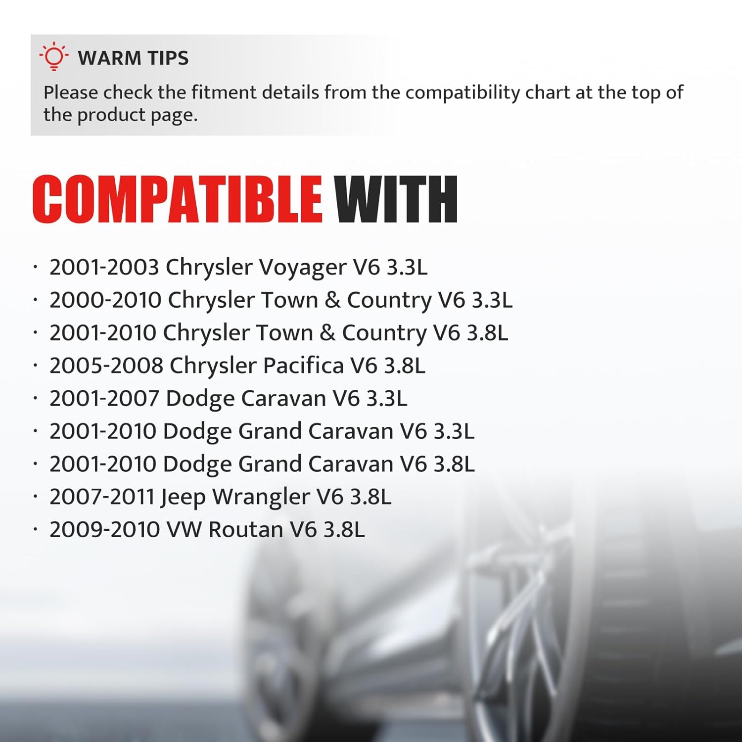 – V6 3.8L: Compatível com Chrysler Town & Country (2001-2010), Chrysler Pacifica (2005-2008), Dodge Grand Caravan (2001-2010), Jeep Wrangler (2007-2011) e VW Routan (2009-2010).