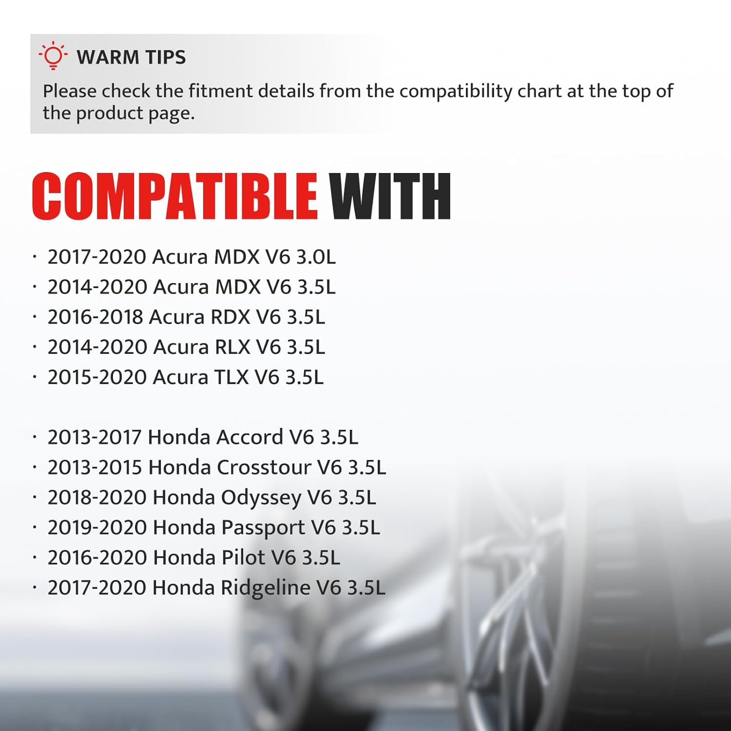 – Acura: V6 3.5L/3.5: 2014-2020 Acura MDX, 2016-2018 Acura RDX, 2014-2020 Acura RLX, 2015-2020 Acura TLX; V6 3.0L/3.0: 2017-2020 Acura MDX.