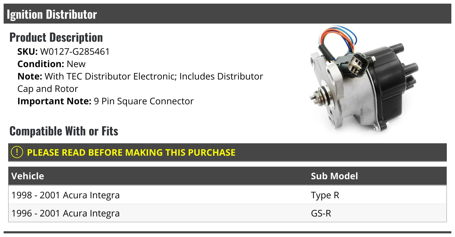3 avaliações para Distribuidor de Ignição com Tampa e Rotor – Compatível com Acura Integra Type-R GS-R 1996-2001 (Distribuidor Eletrônico TEC) com Conector Quadrado de 9 Pinos