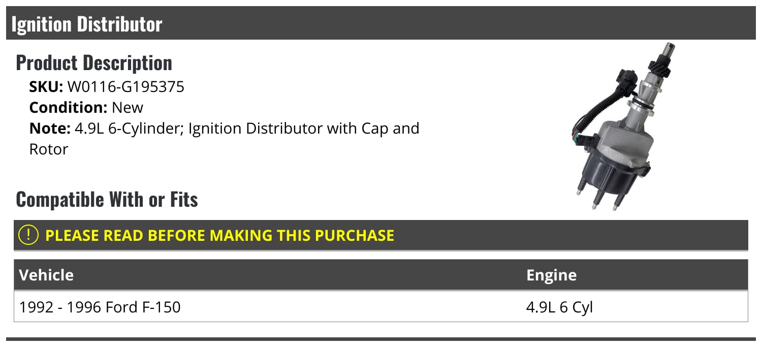 6 avaliações para Distribuidor de Ignição com Tampa e Rotor – Compatível com Ford F-150 4.9L 6-Cilindros 1992-1996