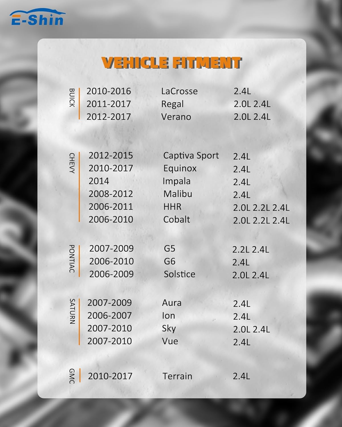 Fitment -1: O Intake é compatível com os modelos Buick de 2010 a 2016, incluindo LaCrosse, Regal (2011-2017) e Verano (2012-2017). Também é adequado para os modelos Chevy de 2012 a 2015, como Captiva Sport, Cobalt (2006-2010), Equinox (2010-2017), HHR (2006-2011), Impala (2014) e Malibu (2008-2012).