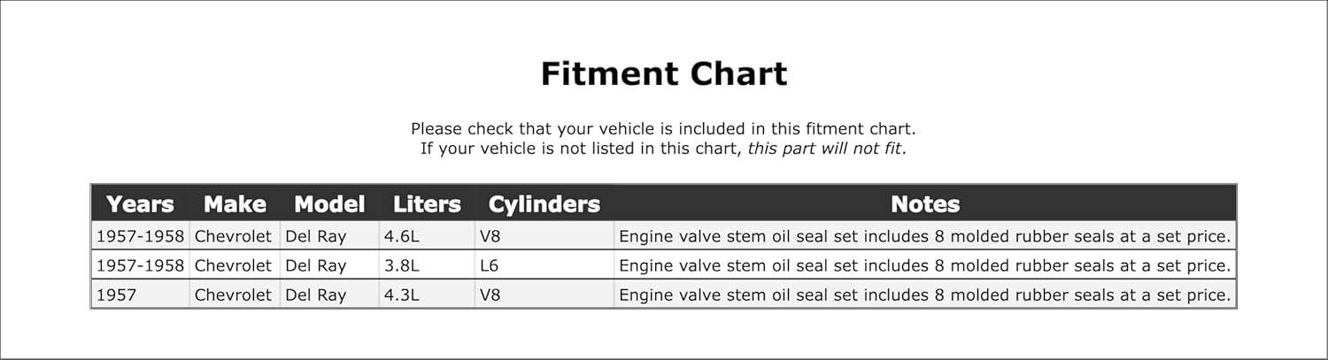 O Conjunto de Selos de Óleo para Válvulas de Stem de Motor de Admissão e Escape é a solução ideal para quem busca manter o desempenho e a eficiência do seu Chevrolet Del Ray 1957-1958. Este conjunto inclui 1 (um) selo de óleo para válvulas, projetado especificamente para se encaixar nas válvulas de admissão e escape do seu veículo, conforme indicado na tabela de compatibilidade da galeria de imagens.