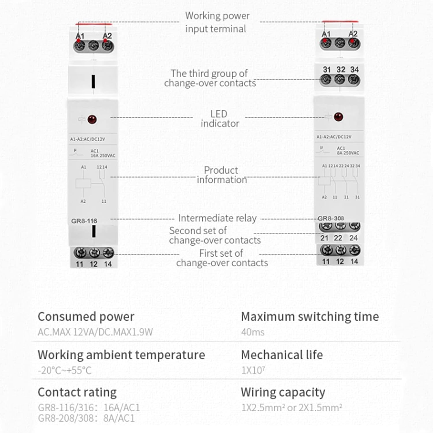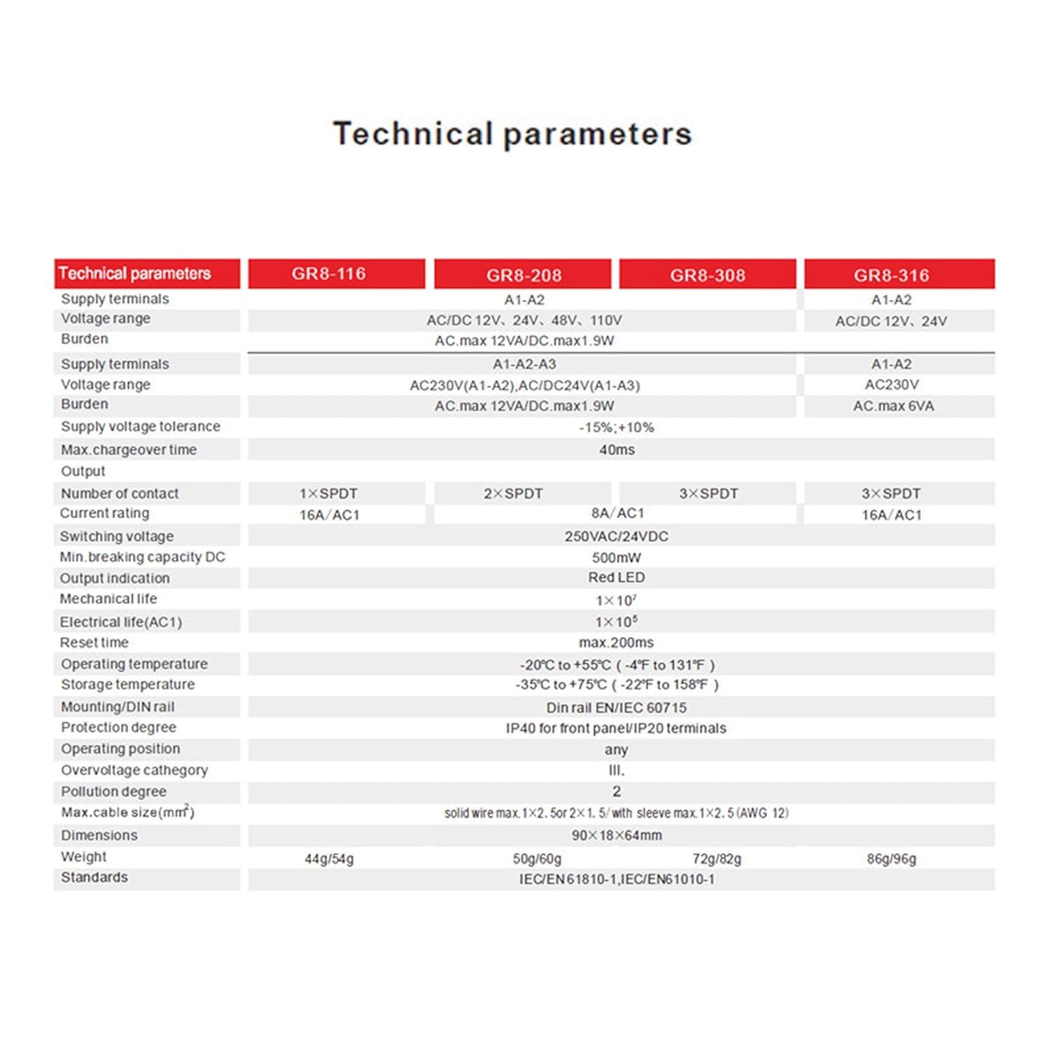 A indicação de status do relé é feita através de LEDs, que proporcionam uma visualização clara e imediata do funcionamento do dispositivo. Com apenas 18mm de largura e 35mm de altura para montagem em trilho, o GR8-116 é ideal para aplicações onde o espaço é limitado, sem comprometer a eficiência e a segurança.